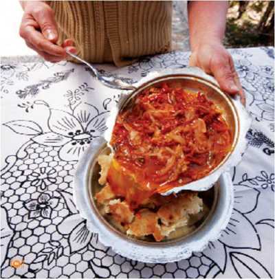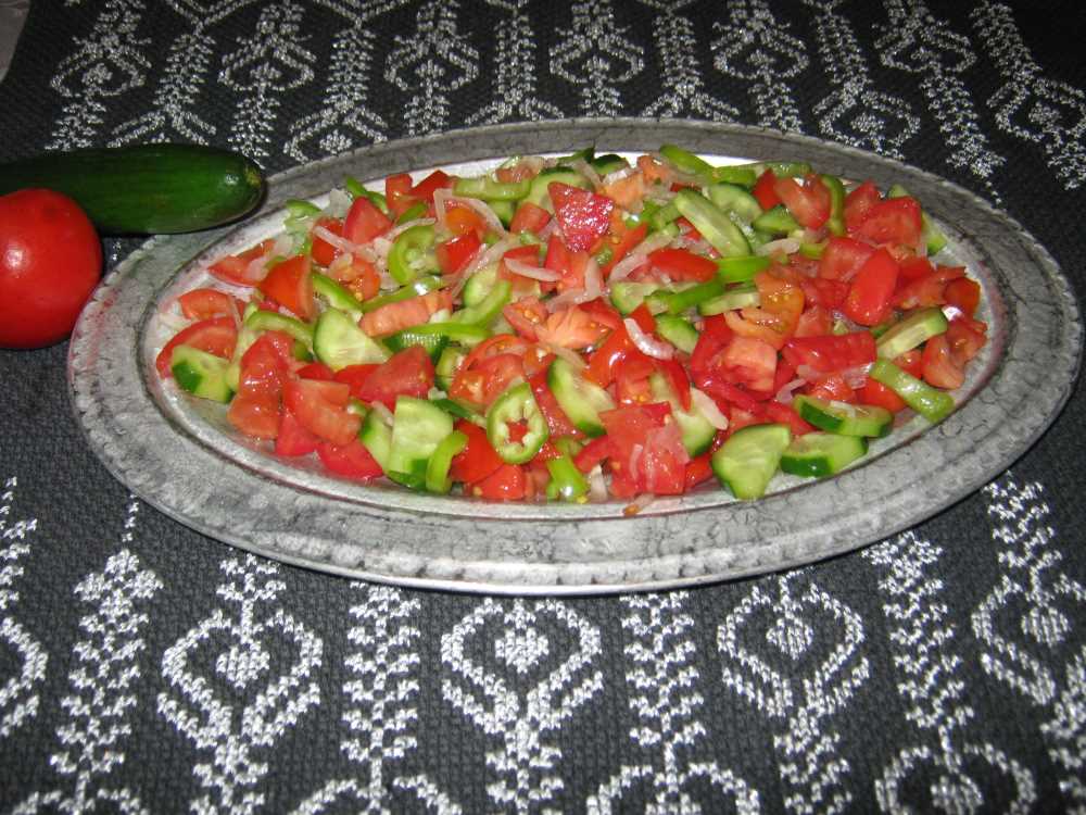 İnce şekilde doğranmış soğanlar tuzla ovularak diriliğinin gitmesi sağlanır. Soğan yıkanarak hazır hale getirilir. Salatalıklar, biberler, domatesler normal kalınlıkta doğrandıktan sonra bütün malzemeler karıştırılır. Karışıma tuz, sirke ve zeytinyağı konularak ezdirmeden çatalla karıştırılıp servise hazırlanır.