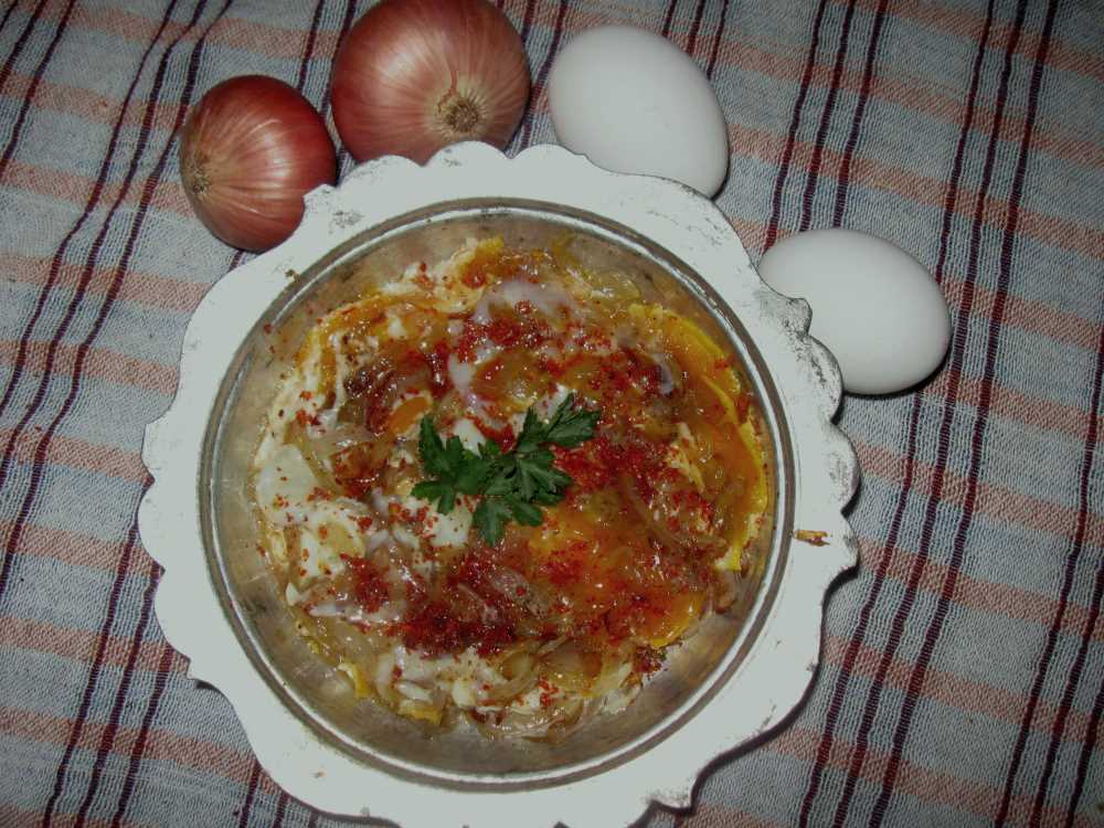 Piyazlık doğranan soğanlar tavaya alınır. Yağ ilave edilir ve soğanlar yumuşayıncaya kadar kavrulur. Üzerine yumurtalar kırılır. Tuz ilave edilip birkaç defa karıştırılır ve ocaktan alınır. Tavanın kapağı kapatılarak 10 dakika dinlendirilir. Pul biber ve karabiber ekilerek servis yapılır.