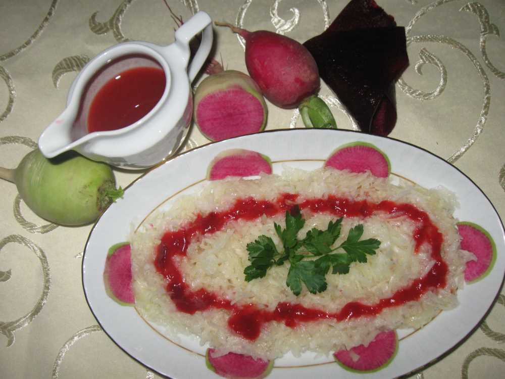 Sırma küçük parçalar halinde doğranıp, bir fincan ılık suda ıslatılıp eritilir. Turplar soyulup rendelenerek, elde suyu sıkıldıktan sonra geniş bir kâse içine konulur. Üzerine tuz, yağ ilave edilip iyice harmanlandıktan sonra servis tabağına alınır ve hazırlanan sırma sosu üzerine gezdirilir.
