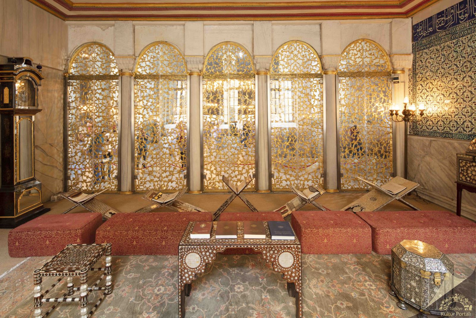 Kütüphanenin okuma bölümünde üzerinde kitap okunan, yazı yazılan, bazıları açılıp kapanabilen, alçak, küçük masa şeklinde sedef kakma tekniği ile süslü ahşaptan rahleler ile Kur'an-ı Kerim'lerin içinde korunduğu iki adet sedef, fildişi kaplamalı Kur'an mahfazası bulunmaktadır.