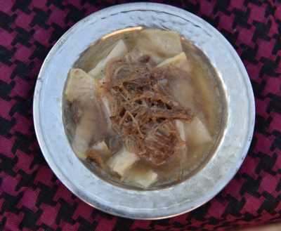 Bir tencereye sıvı yağ ile margarini koyarak kızdırmalı, sonra bu yağa aşağı yukarı iki-üç santim boyunda yarım santim eninde ince ve uzun parçalara doğranmış koyun eti ilave ederek, etler iyice kızarmış bir renk alıncaya kadar karıştırmak suretiyle kavurmalı, sonra da kavrulmuş bu etlere piyaz soğanı denen yarım ay şeklinde doğranmış soğanın yarısını ilave ederek, soğanlar pembe bir hal alıncaya kadar bunları da karıştırarak kavurmaya devam edilmelidir. Doğranmış 2 adet domates ilave ederek, domatesler suyunu çekinceye kadar pişirmeye devam etmeli, sonra da tuz ve kalan soğanları da ilave ederek beraberce bir beş dakika daha pişirdikten sonra, iki-üç defada olmak üzere 2 bardak sıcak su katmalı ve etler iyice yumuşak bir hal alıncaya kadar tencerenin kapağını kapatıp, orta ateşte bir-iki saat pişirilmelidir.