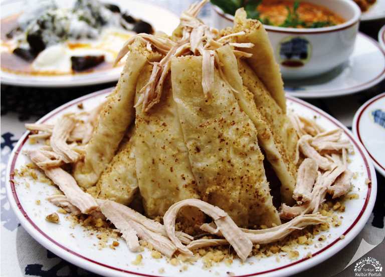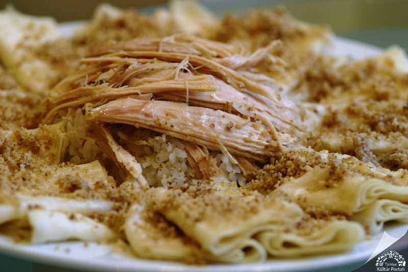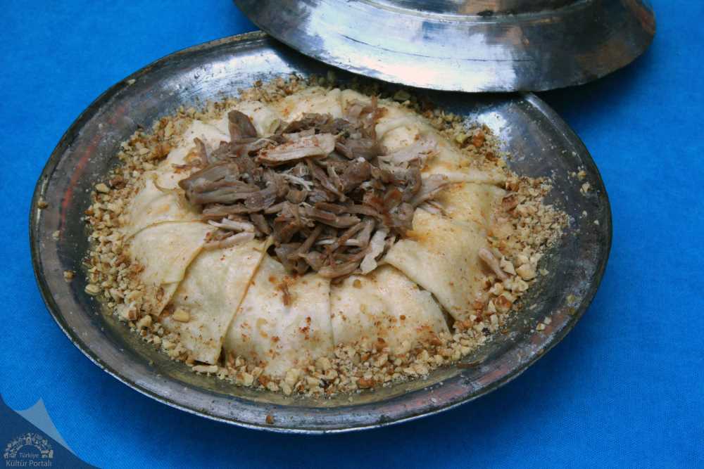 Önce hindi pişirilerek suyu elde edilir. Sonra un su ve tuz ile yoğrulur. Elde edilen hamur yufka haline getirilerek pişirilir. Ceviz içi ufalanarak bir tepsi içinde önceden kızartılmış tereyağı ile yağlanır. Pişirilen hamurlar yufka halinde iken rulo şeklinde kesilir ve hazırlanmış olan hindi suyuna bandırılarak bir tepsiye dizilir. Bu tepsideki hamurların üzerine hindi eti parçaları ve ufalanarak yağlanmış ceviz içi konur ve yine hindi suyu ilave edilerek ocakta altı kızarana kadar pişirilir. Ocaktan çıkınca eritilmiş tereyağı dökülerek servise hazır hale getirilir.