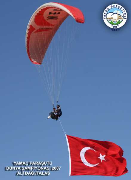 Talas İlçesi'nin yamaçlarına kurulduğu Ali Dağı, ülkemizdeki belli başlı yamaç paraşütü merkezlerinden biridir. Ali Dağı, Kayseri il merkezine 15 dakika uzaklıktadır. Zirve çıkış kolaylığı, mesafe yarışları için iyi termik ve hava akımları sunan Ali Dağı, sporcuları 130 kilometre uçabilmelerine olanak sağlamaktadır. 5400 metre yüksekliğe kadar uçuş yapılabilinen Ali Dağı, yamaç paraşütü konusunda uluslararası bir merkez niteliği taşımaktadır. 600 ile 750 metre irtifa farkına sahip, birisi güney, diğeri kuzey rüzgarlarına uygun iki kalkış pisti bulunmaktadır.