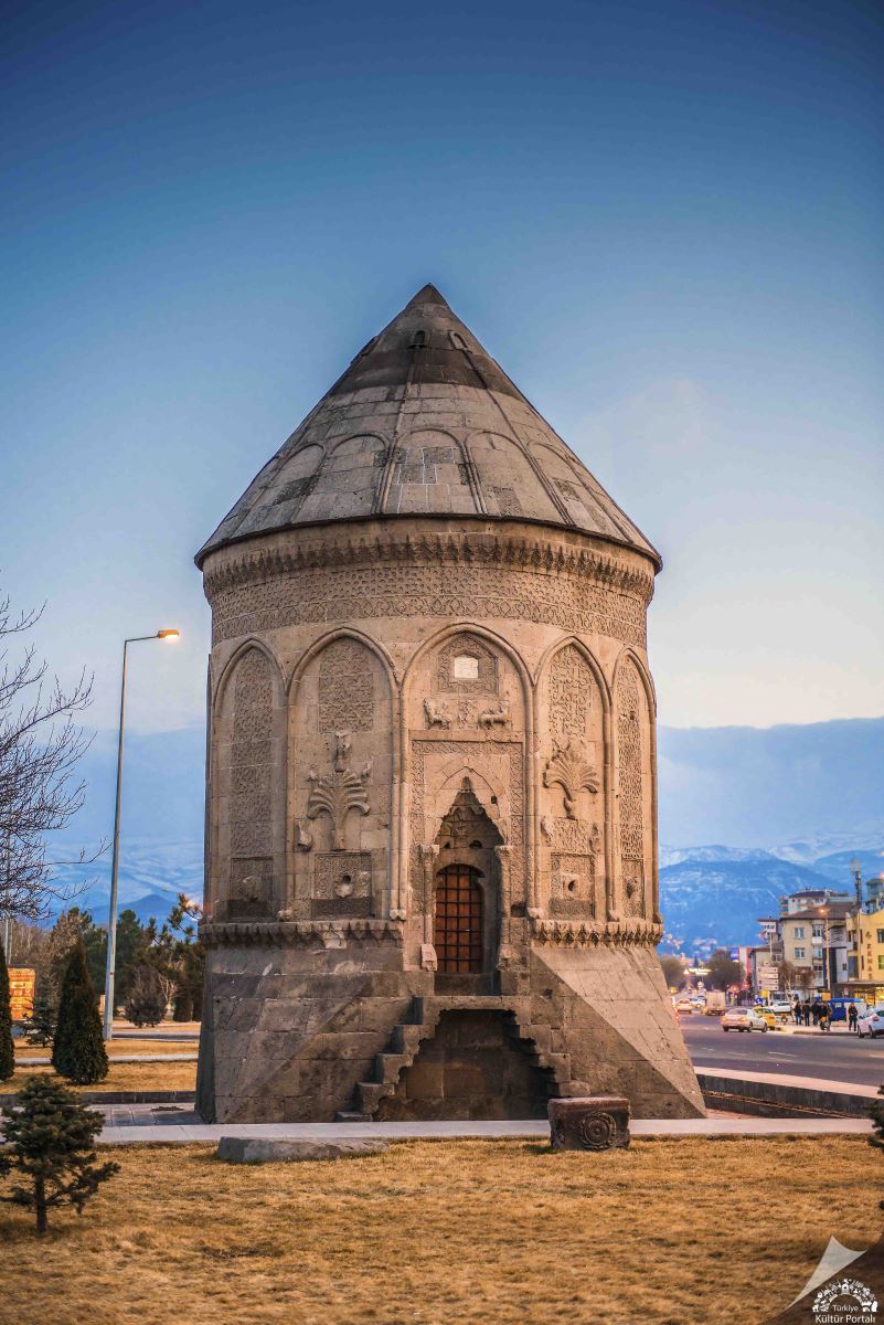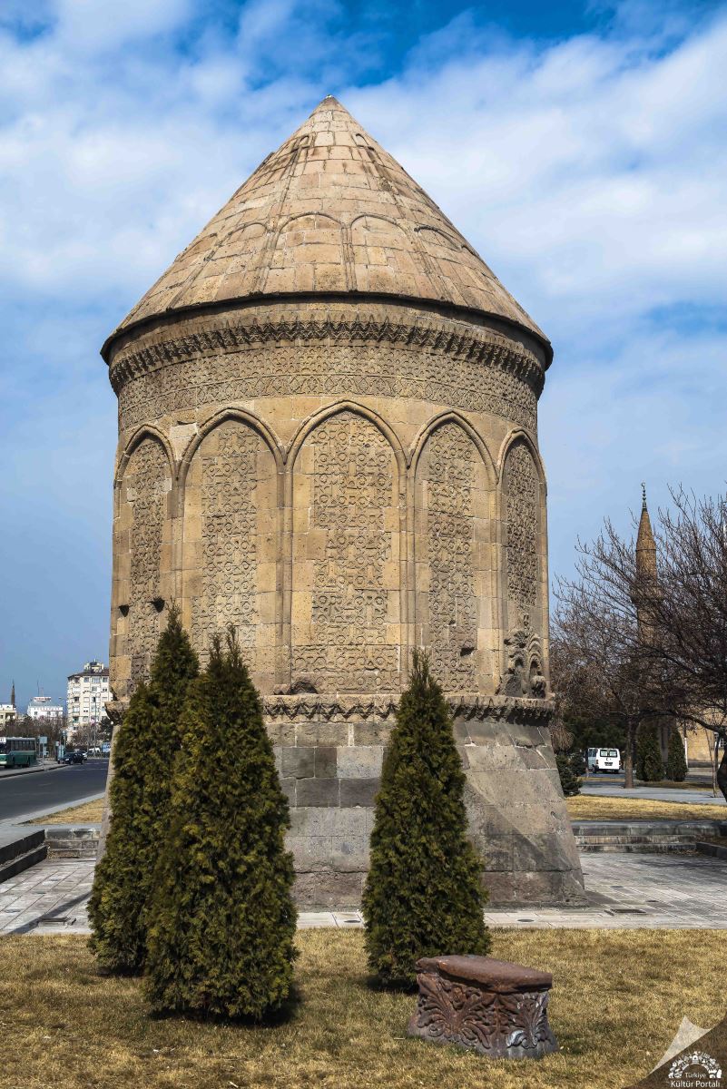 Çift başlı kartal, insan başlı ve kanatlı pars, aslan ve hayat ağacı figürleriyle süslü kümbet, kare bir kaide üzerine on iki köşeli bir gövdesi olup, tamamen kesme taştan, mukarnas kornişler üzerine konik külahla, içten ise silindirik mekân üzerine kubbe ile örtülüdür.