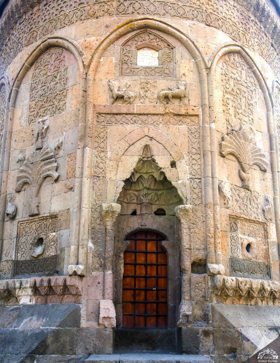 Figürlü plastik süslemelerin bolluğu ile göze çarpan ve abidevi bir çadırı andıran kümbetin kapı cephesi üstünde, insan başlı, kanatlı iki pars figürü arasında çift başlı kartal arması tahrip edilmiş halde belli olmaktadır.
