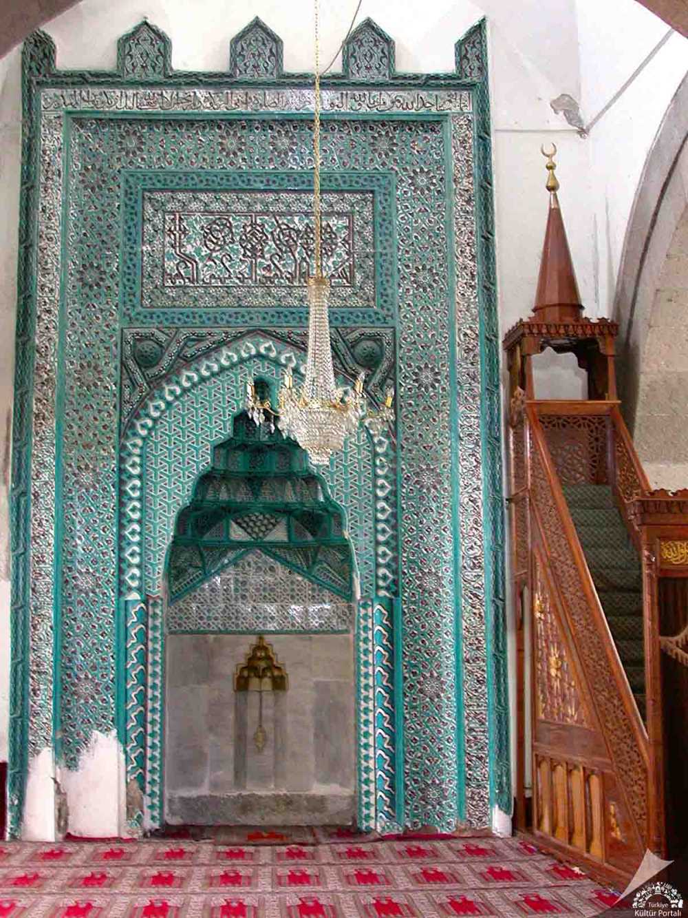 Bu bölümün kıble duvarında bulunan mozaik çini mihrap, anıtsal boyutlara ulaşmış ölçüleri ve dekoratif görünüşü ile bütün mekâna hakim bir unsur olarak belirmektedir. Kubbe eteğine kadar çıkarak 7,32 metre yüksekliğe ulaşan 4,20 metre genişliğindeki bu muhteşem mihrap sağ tarafında bulunan 90 cm enindeki minbere yer açmak amacıyla 30 cm. kadar sol tarafa yanaştırılarak akstan kaydırılmıştır. Mimari süslemede çiniyi yer yer kullanmış olmakla birlikte, daha ziyade mahalli bir malzeme olan taşı benimsemiş bulunan Kayseri'de mahalli geleneğin dışına çıkılarak ortaya konmuş böylesine muhteşem bir eserin varlığı, mozaik çini mihrapların bir gelenek halinde inşa edildiği Konya ile bir bağlantı kurmak suretiyle açıklanabilir. Yapım tarihi ve ustası kesin olarak bilinmeyen bu mihrap sanat tarihi araştırmacıları tarafından 13. yüzyılın ikinci yansına veya sonlarına tarihlendirilmektedir.