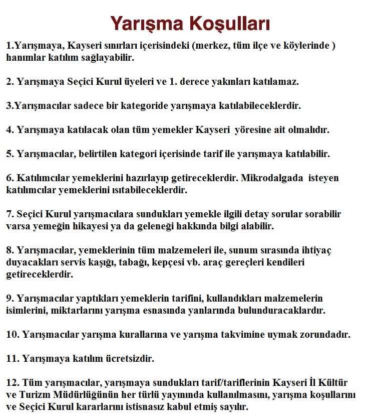 “Bilindiği gibi Türk mutfaklarının çok önemli bir yeri var. Malumunuz Turizm Bakanlığımız ve Valiliğimizce kültürel değerlerimizi ortaya çıkarmak ve yaşatmak için önem veriyoruz. Başlangıçlar, Ana Yemek ve Tatlılar olmak üzere Üç kategoride düzenleyeceğimiz yarışmaya Kayserili hemşehrilerimiz katılabilir. Taymuş, “Buradaki arzumuz Kayseri’de yaşayan yemek yapmaktan hoşlanan başta annelerimiz olmak üzere bu etkinliğe katılarak bu kültürün gelişmesi açısından bizlere destek olması. Dereceye giren yarışmacılara değerli ödüller verilecek. Ayrıca dereceye giren yarışmacıların yemek tariflerini alarak turistlerin tatil için gittiği otellere bu tarifleri işletmelere vereceğiz. Bu turistler bu şekilde bizim yöremizin yemeklerini öğrenmiş olacak.”