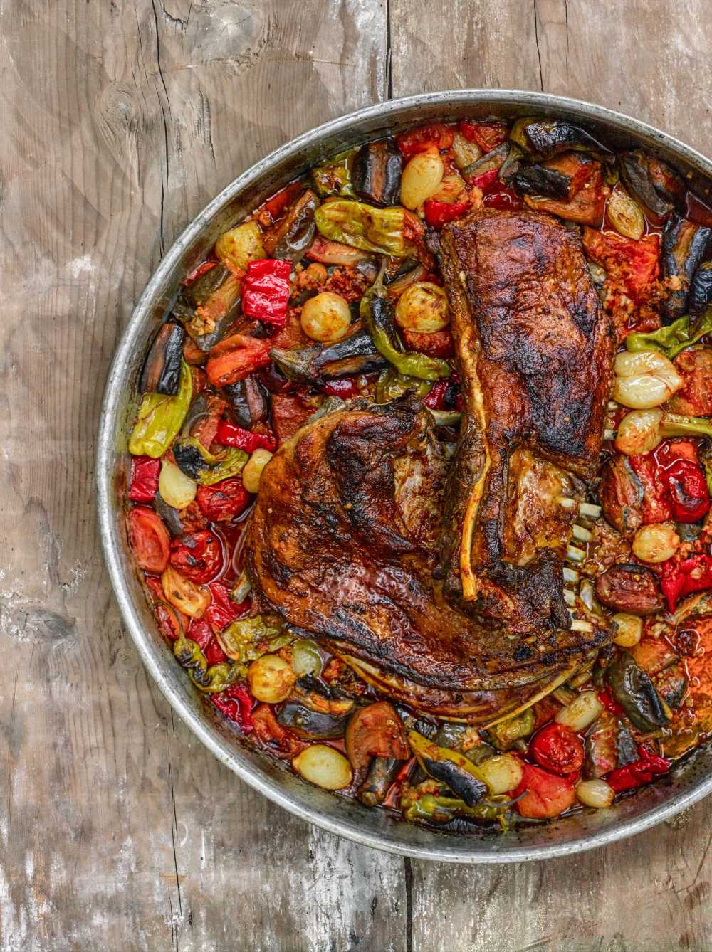 Yıkanan kaburganın üzerine zeytinyağı gezdirilir ve 2 tarafı da eşit kızartılır. Patlıcanlar alacalı soyulup ardından dörde bölünerek parmak şeklinde doğranır. Patlıcanların acısını çıkartmak için, hazırlanan tuzlu suda 20 dakika bekletilir. Soğan, domates ve biberler iri iri doğranır. Doğranmış sebzeler ve soyulmuş sarımsaklar tepsiye alınır. Üzerine tuz, karabiber ve salça ilave edilerek harmanlanır. Zeytinyağında kavrulan kaburga tepsinin ortasına yerleştirilir. Üzerine tereyağı parçaları atılıp 180 derece fırında üstü kapalı 2 saat pişirilip servis edilir.
