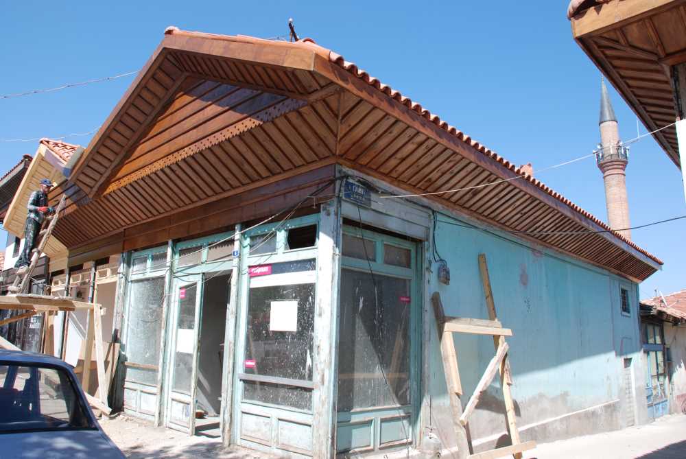 Cumhuriyet Meydanına bakan sokağın başında yan yana iki dükkan ahşap karkas yapılıdır. Tek katlı ve birbirine bitişik bu iki dükkan, ortada kapısı olan iki yanda ikişer vitrinlidirler. her ikisi de üçgen alınlıklı ve müşterek kırma çatılıdır. çatı alaturka kiremitlidir. içte taban, tavan ve döşeme ahşaptır ve eski özelliklerini korumaktadır. |