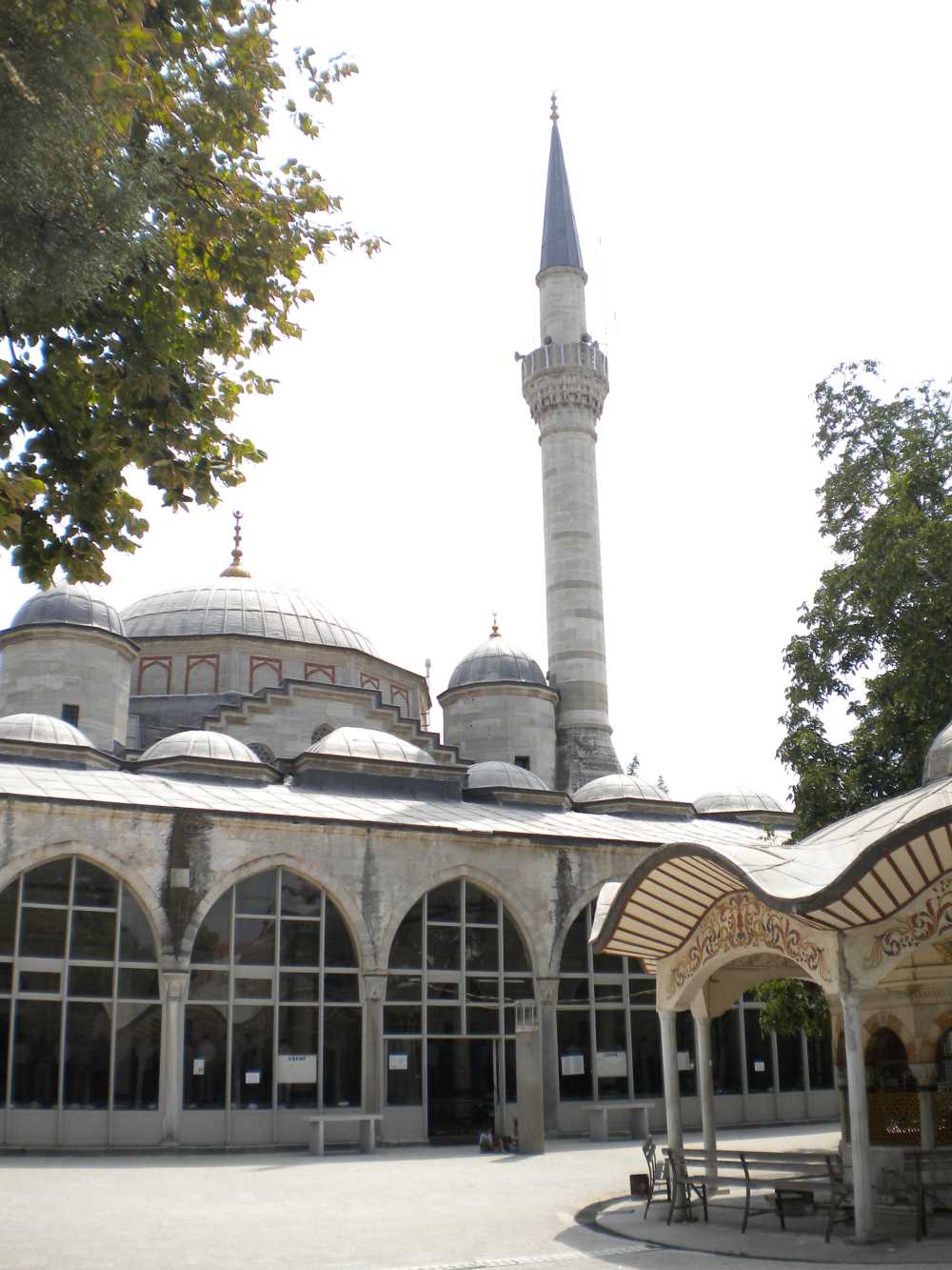 Avlu medrese ile ortaktır. Avlu revakları son cemaat yerine birleştirilmemiştir. Çifte son cemaat yerinin ayrı bir varlığı vardır. Caminin önünde yanlara genişlemiş ve ileriye taşmış şekli ile ayrı bir kütle görünümündedir. Son cemaat yerinin sağda ve solda camiden yana taşan duvarlarında ve ileri taşan duvarlarında ikişer pencere açılmıştır. Bu pencerelerin tamamı sivri kemerli, dikdörtgen pencereler olup bronz korkuluklara sahiptirler. Bazı klasik son cemaat yerlerinde olduğu gibi iklim zorunluluğundan üç tarafı kapatılmış, çifte son cemaat yerlerinin bir benzeri durumundaki bu çifte son cemaat yerinin karanlık havası, yanlara ve ileri taşan duvarlarında açılan pencereler ile giderilmiş, ışık alması sağlanmıştır.