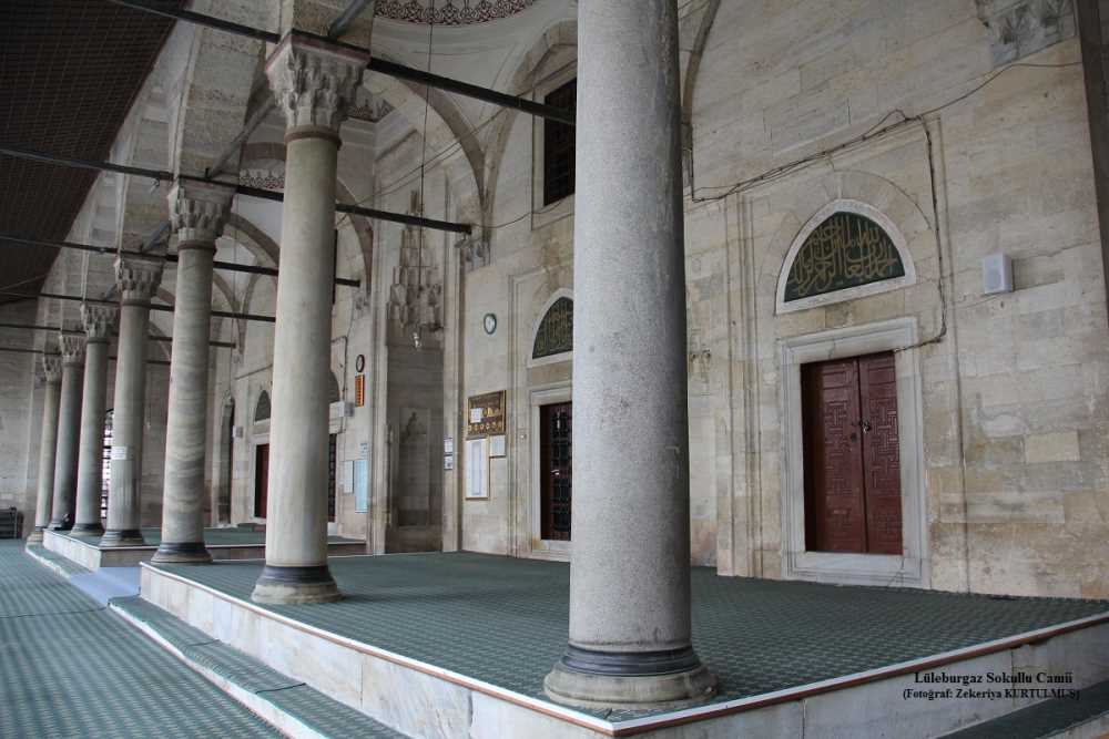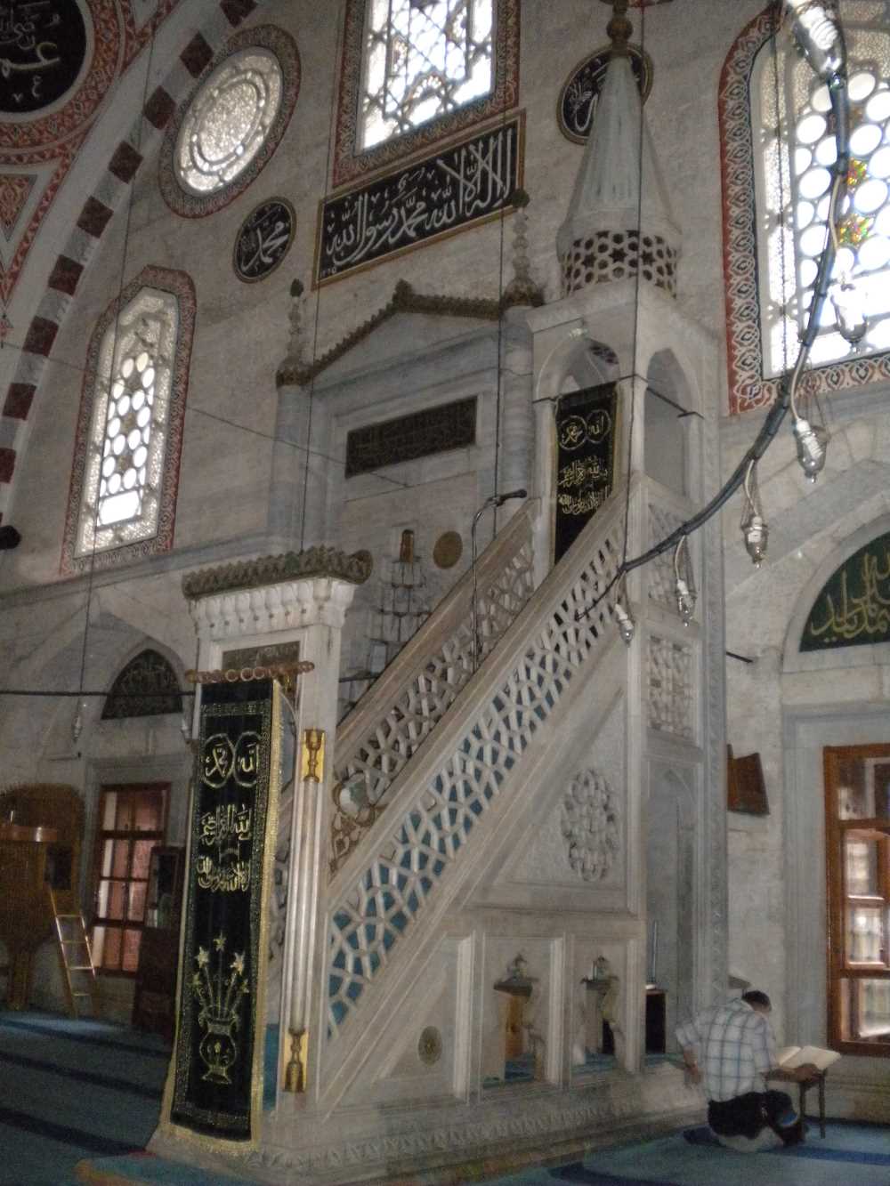 İç son cemaat yeri skalaktif başlıklı 9 sivri kemer üzerine oturan 8 kubbe ve 1 tonozdan ibarettir. Tonoz tam ortada olup, cümle kapısının önüne denk gelmektedir. Bu kubbelerde ve tonozda 1983 yılı onarımında yapılmış kalem işi süslemeler vardır. Kuzey cephenin tam ortasında cümle kapısı yer alır. Tek kubbeli camiler içinde özel yer tutan caminin içine girildiğinde, yapının sınırlarının genişletildiğine tanık olunmaktadır. Ortadaki büyük kubbe köşelerdeki dört ayak üzerinden 2.75 metre genişliğinde sivri kemerlerle oturmaktadır. Giriş ile aynı eksende ve sade bir görünüşte olan mihrap nişi beş köşelidir. Mihrabı ve mühezzin mahfili mermerdendir. Yapının sağında minare yükselmektedir. Eski şekline uygun biçimde 1937 yılında yapılmıştır. Caminin avlusu, medresenin avlusu ile ortaktır. İşte bu ortak avlunun ortasında 12 kenarlı bir şadırvan bulunur. II. Mahmut devrine ait bir kitabesi vardır.