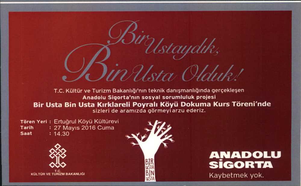 Kültür ve Turizm Bakanlığımızca; İlimizde geleneksel olarak sürdürülen yerel meslekleri yaşatmak amacıyla, Anadolu Sigorta Anonim Şirketinin sponsorluğunda “Bir Usta Bin Usta Sosyal Sorumluluk Projesi” ismiyle İlimiz Lüleburgaz İlçesi Ertuğrul Köyünde 09 Mart 2016 – 26 Mayıs 2016 tarihleri arasında 280 saatlik “Dokuma Kursu” açıldı.