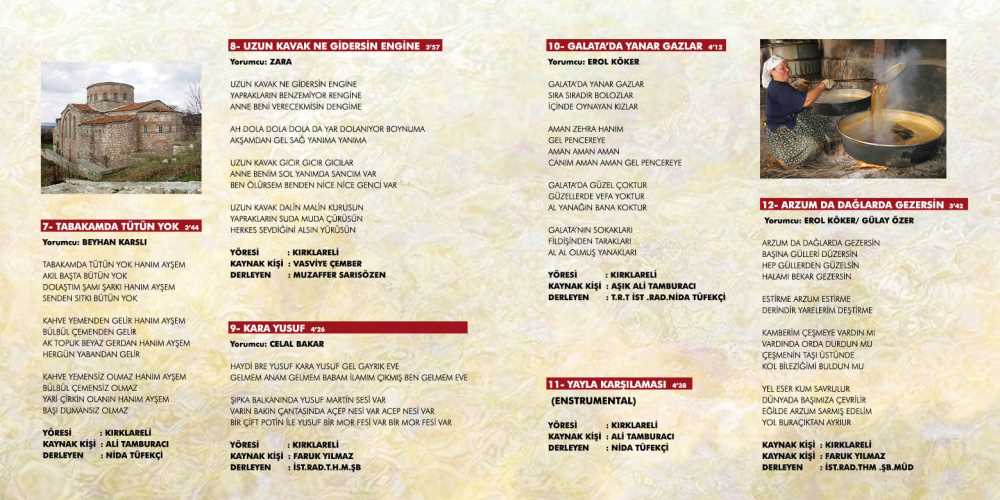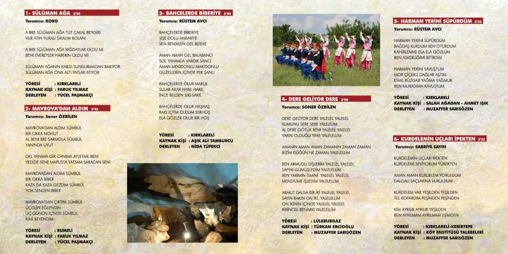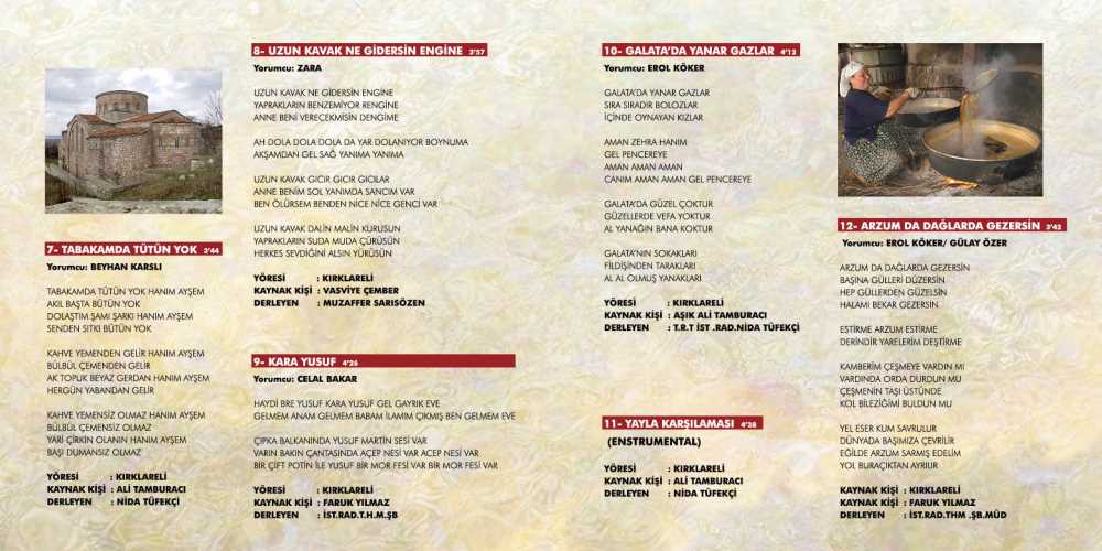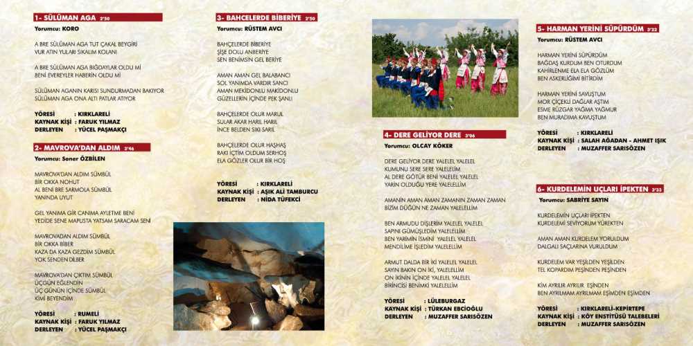 Ayrıca Kırklareli yöresi türkülerinin derlenerek tanıtılması ve gelecek kuşaklara aktarılmasında Aşık Ali TAMBURACI, Muzaffer SARISÖZEN, Hüseyin YALTIRIK gibi sanatçı ve müzik araştırmacılarının büyük katkıları bulunmaktadır. Şimdi yukarıda isimleri belirtilen araştırmacı, derlemeci ve sanatçılar tarafından derlenerek arşive kazandırılan, notaya alınarak CD ortamında dinleyicilere ulaştırılan ve böylece gelecek kuşaklara aktarılması sağlanan türkülerden birkaçı aşağıda belirtilmektedir.