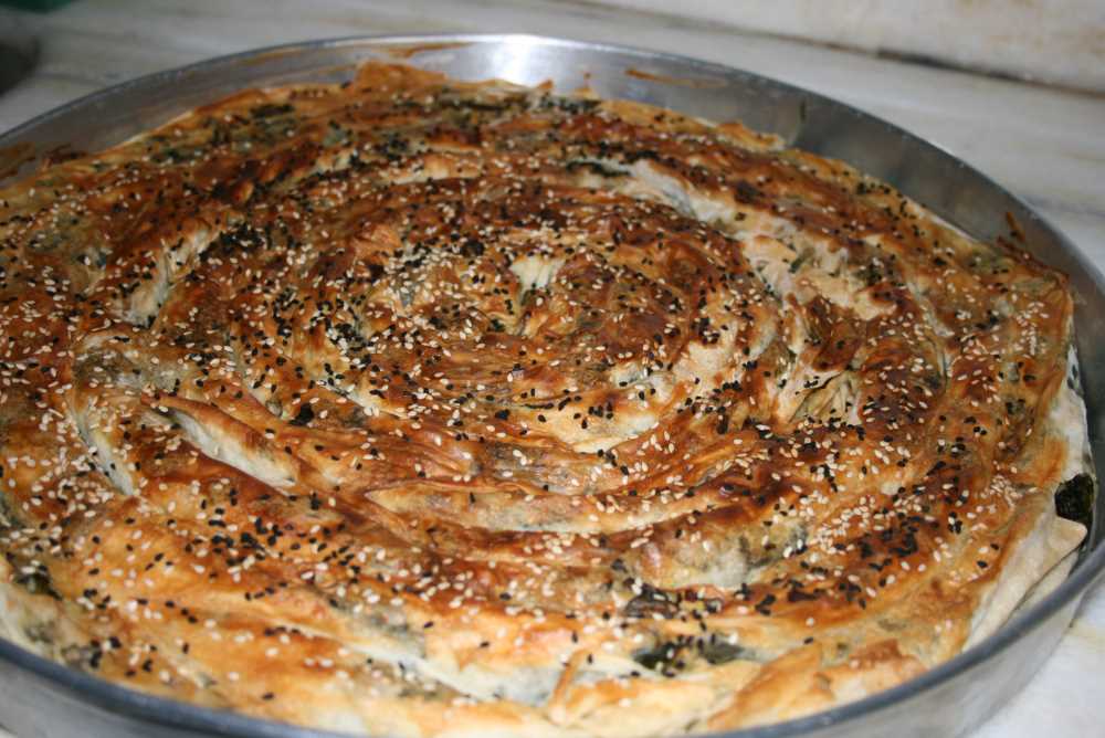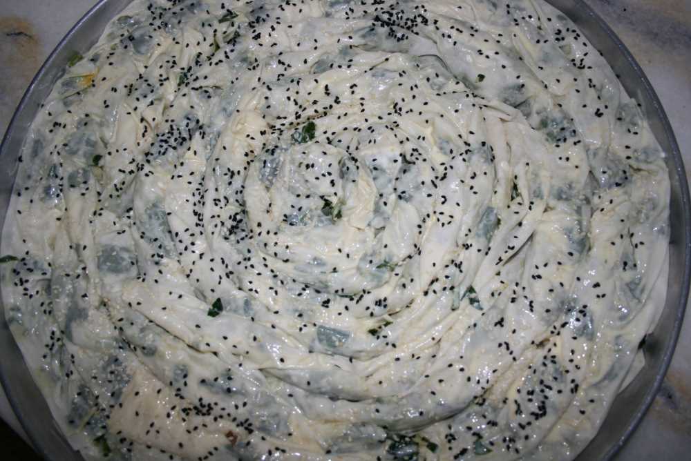 Ispanak temizlenir. Küçük küçük doğranır. 1 adet kuru soğan içine doğranır. Biraz sıvı yağ, tuz, kara biber ve kırmızı biber ilave edilerek ıspanaklar sıkılır ve öldürülür. Yufkalar ortadan ikiye bölünüp hazırlanmış harçtan içine serpilerek rulo yapılır. Tepsinin ortasından başlayıp dolaya dolaya tepsi doluncaya kadar aynı yöntem izlenir. Yoğurt ve yumurta çırpılıp yufkaların üzerine sürülür. En son olarak da susam ve çörek otu serpilir ve fırına verilir.