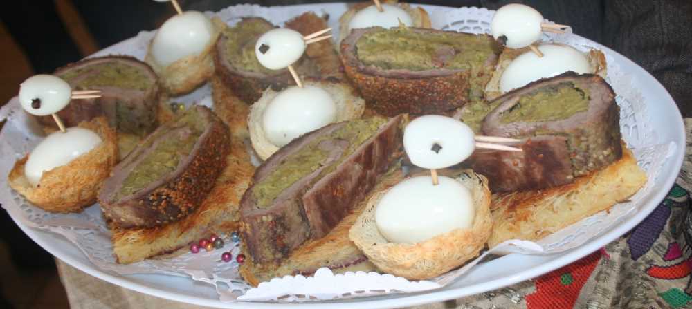 Kadayıfın yarısı dikdörtgen bir tepsiye bastırarak serilir, üzerine pastırma ve dil peyniri dizilir, kalan kadayıf yine bastırılarak üzeri kapatılır, margarin doğranarak üzerine koyulur. Yumurta ve süt karıştırılıp üzerine dökülür 190 derecede pişirilir. Bezelye haşlayıp, püre haline getirilir. Patlıcanlar közlenip püre haline getirilip içerisine sarımsak ilave edilir. İnce bir şekilde açılan bonfile etin üzerine, önce bezelye püresi daha sonra patlıcan püresi sürülüp kaşar rendesi serpilir, rulo yapıp folyo ile sarıp buzdolabında 2 saat bekletilir. Dolaptan çıkarılan et, folyo ile 250 derecelik fırında pişirilir. Kontrol etmek için folyoyu açılır, üzerine yumurta sarısı sürülür, bol susam serpilir ve kızarana kadar tekrar pişirilir. Serviste dilim kesilmiş kadayıf böreğinin üzerine bir dilim bonfile sarma koyulup servis edilir.