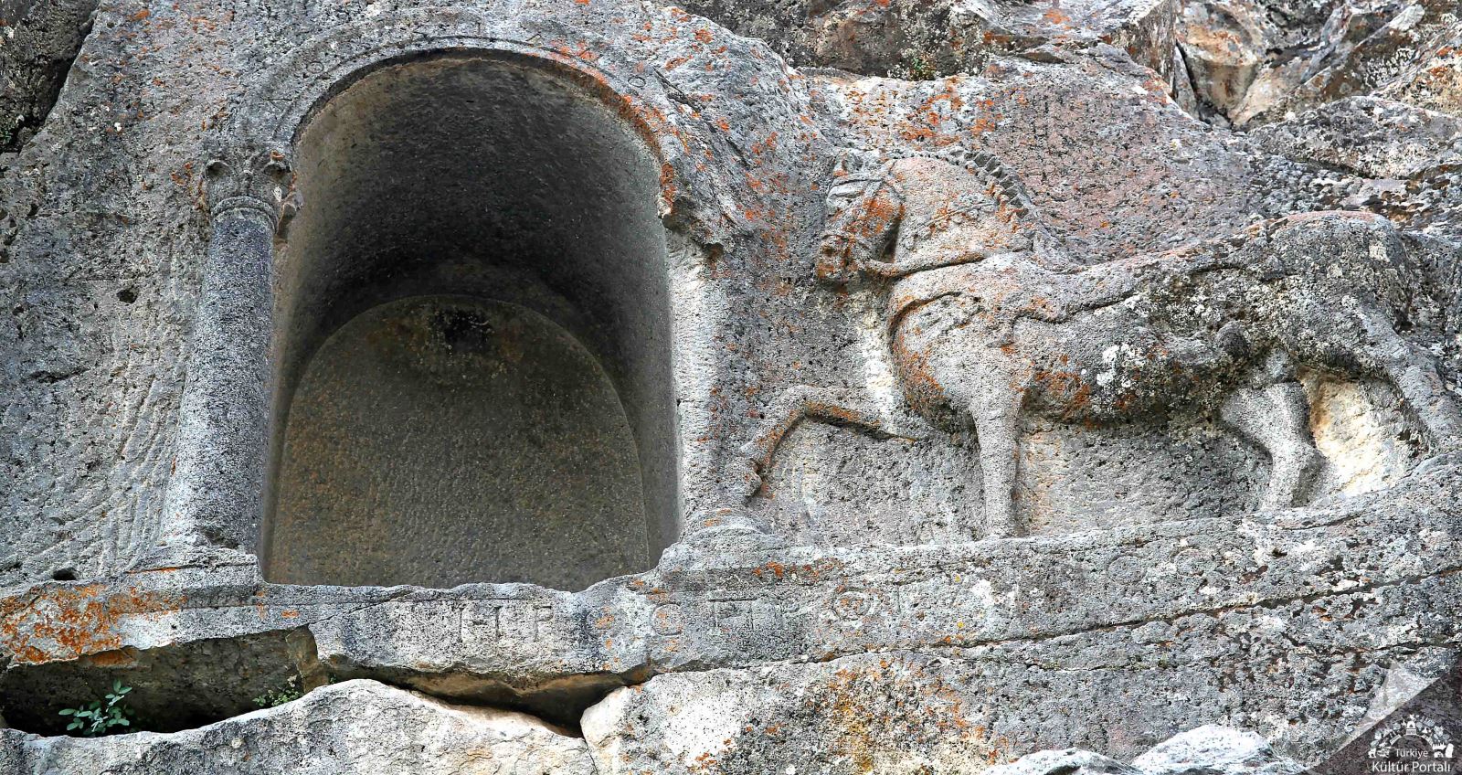 Anıt, yerden 10 metre kadar yükseklikteki dik bir kayanın üzerine oyulmuş 1,85 metre boyunda bir at kabartması ve bir nişten oluşmaktadır. At kabartmasının sağında ise zeminden 5 metre kadar yükseklikte 0,85 x 0,95 metre boyutlarında Grekçe bir kitabe yer almaktadır.