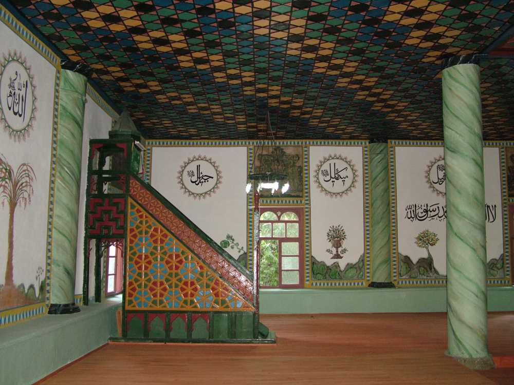 Caminin iç mekân duvarlarında kalem işi süslemeler bulunmaktadır. Sanatçısı bilinmeyen süslemeler harim duvarları, ahşap tavan, kubbe içi, minber ve vaaz kürsüsünde yoğunlaşmıştır. Doğu, batı ve güney duvarlar birbirlerinden farklı boyutlardaki panolara ayrılmış ve süslemeler bu panoların içerisine yapılmıştır. Süslemelerde, Kuran-ı Kerim’den ayetler, bitkisel motifler, saat, cami ve hayat ağacı gibi resimler yer almaktadır.