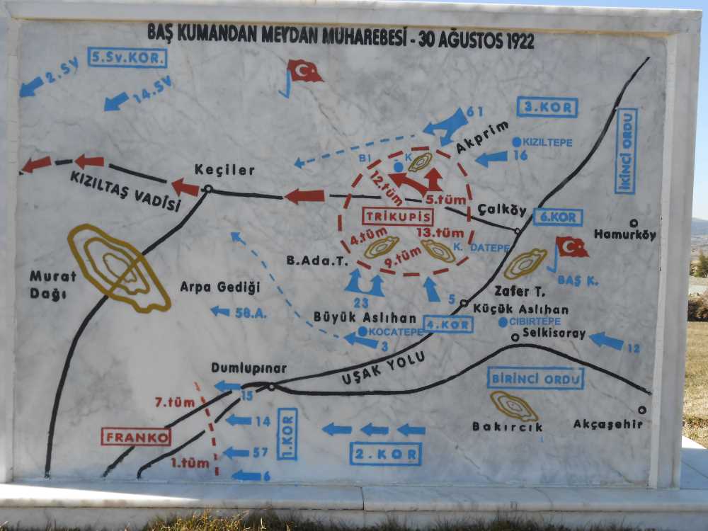 Zafertepeçalköy'de Başkomutan Meydan Muharebesi'nin sevk ve idare edildiği 1181 rakımlı tepede yaptırılmıştır. 1964 yılında yapımına başlanmış ve 1968 yılında ziyarete açılmıştır. 30 Ağustos Zafer Bayramı törenlerinin düzenlendiği yerdir. Çatılmış silahların uzaktan görünüşü ve alev alev meşale hissini uyandıran Zafer Anıtı, asıl manası ile kurtuluş savaşımızı sembolize eder. Anıtı bir bütün olarak meydana getiren değişik yöndeki üçgen bloklar; milletimize gösterilen haksızlığa, feverana, karşı milletimizin tek vücut halinde birleşerek kazandığı 30 Ağustos Zaferini canlandırır. Anıt, gelecek nesillere, Türk milletine karşı içte ve dışta meydana gelebilecek kötü tesirler karşısında er geç birleşerek zafere gidilebileceğini anlatan bir anıttır.