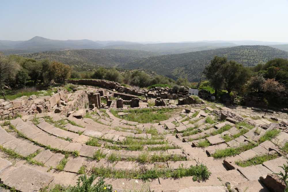 Athena kutsal alanı terasının batısındaki çanağa inşa edilen tiyatro, kuzey rüzgarına karşı korunaklı durumdadır. Vomitorium’un güneyden dayandığı analemna duvarı, dikdörtgen şeklindeki hafif bosajlı kesme blok taşların kullanıldığı atkılı-isodomik sıralı örgüye sahiptir.