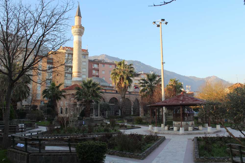 1474 yılında Fatih Sultan Mehmet’in sofracıbaşısı Çeşnigir Sinan tarafından yaptırılmıştır. Enine dikdörtgen planlı, kesme taştan yapılmış, ortada bir büyük, köşelerde ise dört küçük eliptik kubbe ile örtülmüştür. Batı bitişiğindeki kare planlı küçük kütüphane ise, 1831 yılında Karaosmanoğulları’ndan Hacı Sabri Ağa tarafından yaptırılmıştır.