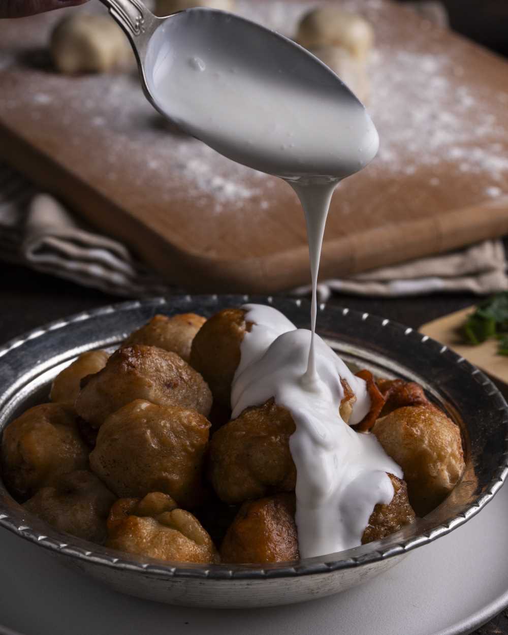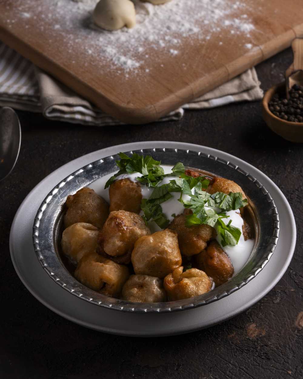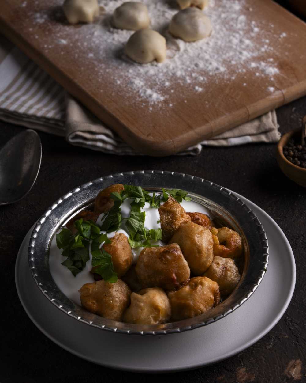 Çok küçük küp doğranmış soğanlar, iyice kıyılmış maydanoz, karabiber kıymaya eklenip iyice yoğrulur. Un, tuz ve yavaş yavaş su eklenerek kulak memesi yumuşaklığında bir hamur yoğrulur ve 2 bezeye ayrılır. Bezeler 70-80 çapında çok ince açılır. Bir yufkanın üzerine 6-7 cm arayla ceviz büyüklüğünde iç koyulur ve araları kesilir. Üç ucu bohça biçiminde katlanır, dördüncü uç ise üzerine kapatılır. Kapamalar zemini yağlanmış tepsinin üzerine katlı kısımları aşağı gelecek biçimde sıralanır. Üzerini örtecek kadar tereyağı, eritilmiş kuyruk yağı ve sıvı yağ kızdırılarak dökülür. Kapamalar yüksek ateşte, pembeleşinceye kadar kızartılır, bozulmadan kevgirle yağını süzeceği bir yere alınır. Üzerine et suyu ya da sarımsaklı yoğurt dökülüp ince kıyılmış maydanoz serpilerek servis yapılır.