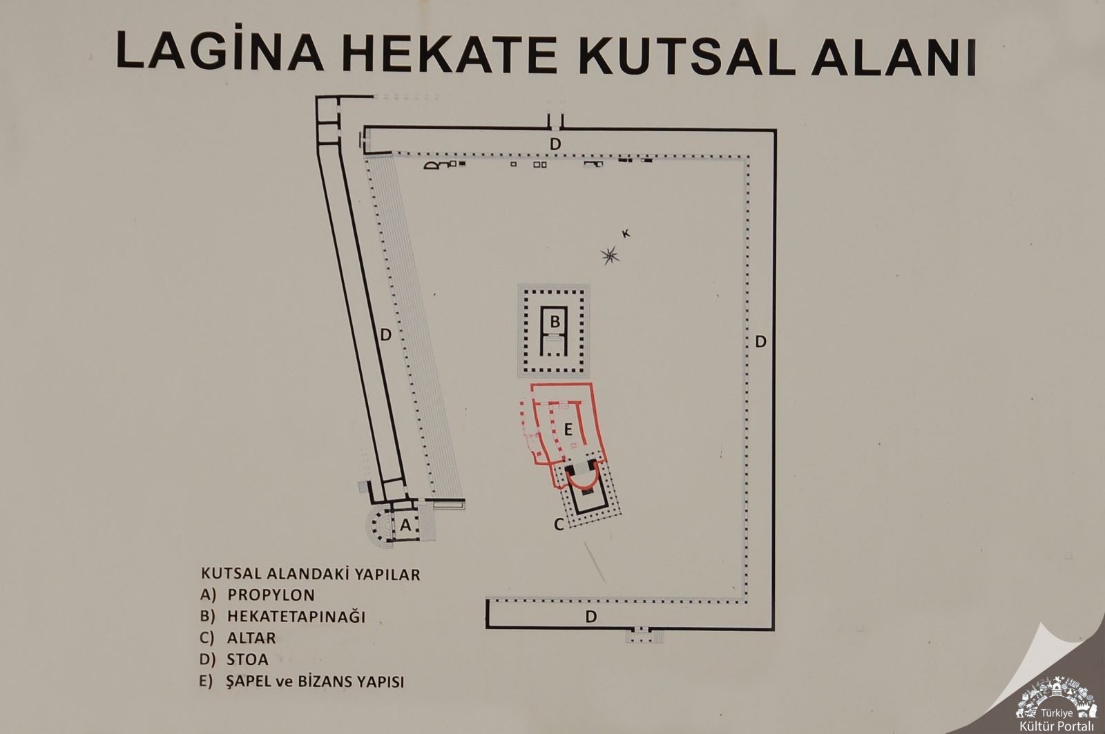 Anıtsal giriş kapısından altara giden taş döşeli yola bağlanan 10 adet merdiven sırası vardır. MÖ 40 yılında Partlarla birleşen Romalı General Labianus Romalılara karşı açtığı mücadelede Stratonikeia'ya saldırır ama ele geçiremez. Bunun üzerine Lagina Hekate Kutsal Alanı’nı yağmalar. Bu yağmada harap olan yapıların tamiri için Augustus MÖ 27 yılında büyük bağışta bulunmuştur. Bu bağış kitabesi halen temenos propylonunun lentosunda (anıtsal giriş kapısının kitabesi) yer almaktadır.