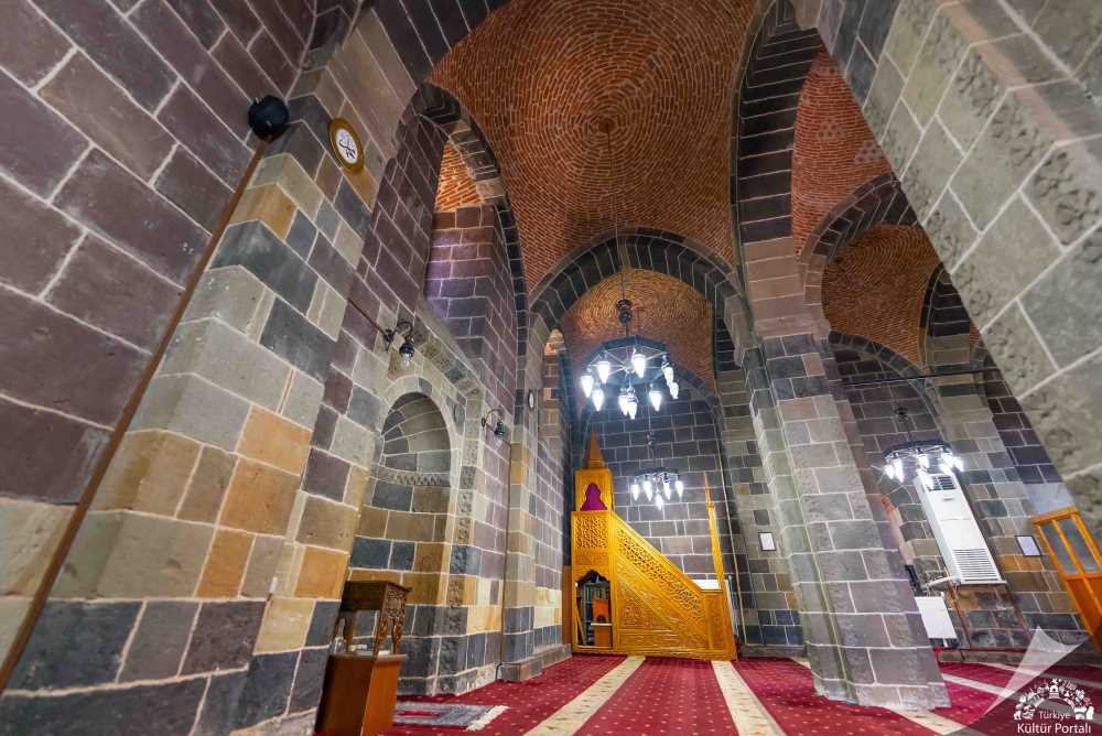 Caminin içi ortada yer alan dört haçvari ayak ve karşılarında, duvardan taşıntılı plastırlar üzerine yaslanan sivri kemerlerle dokuz bölüme ayrılmaktadır. Üst örtüyü taşıyan haçvari ayakların, dış yüzlerinin iki yanları altı kollu papatya şeklindeki kazıma çiçeklerle zeminden kemerlerin üzengi noktalarına kadar süslenmiştir.