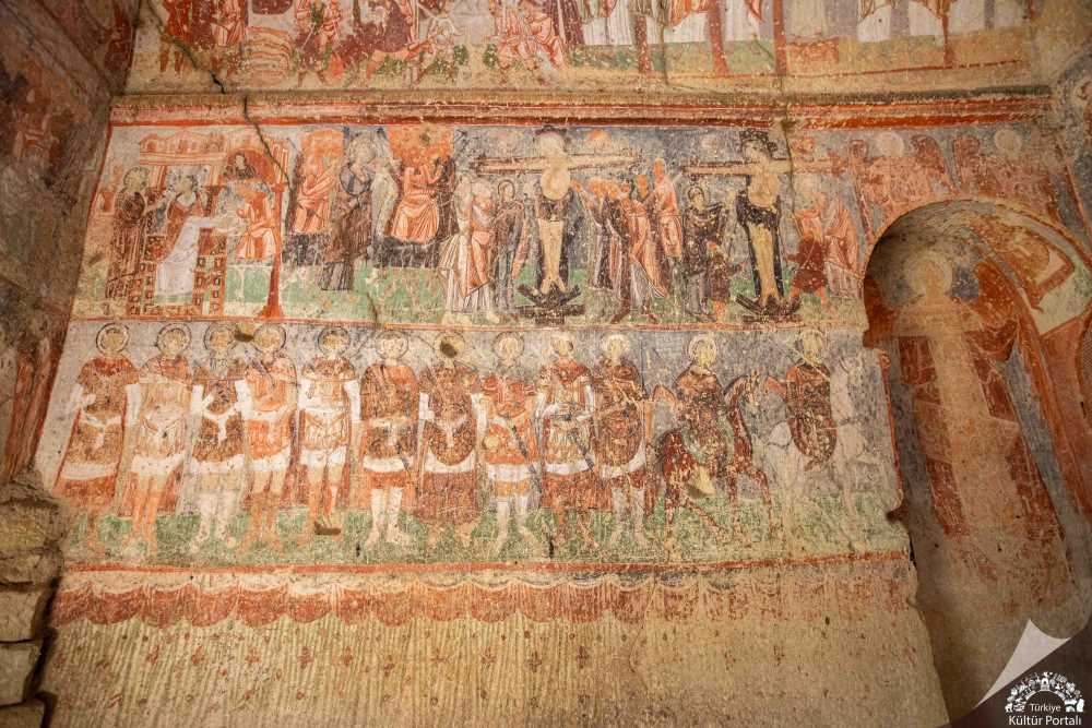 Kilisenin batı duvarında Yusuf ve Meryem Deney Sonrası, Beytüllahim’e Yolculuk, Doğum, Son Yemek, İhanet, İsa’nın Cehenneme İnişi, Vaftiz; kuzey duvarında İsa Platus Önünde, İsa Golgota Yolunda, İsa Çarmıhta, İsa’nın Ölümü; güney duvarında Kudüs’e Giriş, Lazarus’un Diriltilmesi, Kör Adamın İyileştirilmesi, İsa’nın Çarmıhtan İndirilmesi, Kadınlar Boş Mezar Başında sahneleri yer alırken tonozda Müjde, Ziyaret, Bakireliğin İspatı, Mısır’a Kaçış, Yusuf’un İkinci Rüyası, Havarilerin Tanrı Yolunda Görevlendirilmesi, Üç Müneccimin Tapınması, Masum Çocukların Katliamı, Elizabeth’in Takip Edilişi, Zekeriya’nın Öldürülmesi sahnelerine yer verilmiştir. Apsis duvarında ise Başkalaşım Sahnesi resmedilmiştir.