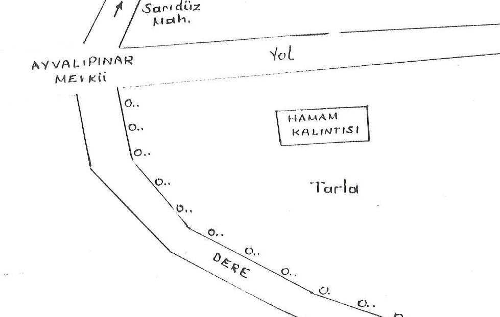 Ayvalıpınar mevkiinde pınarın çok yakınında olan hamam kalıntısı plan özelliği vermemektedir. Çok tahribata uğramış olup kireç harçlı pişmiş toprak yassı tuğla örgülüdür. Kireç harçlar arasında pişmiş topraktan yapılmış su boruları görülmektedir. |