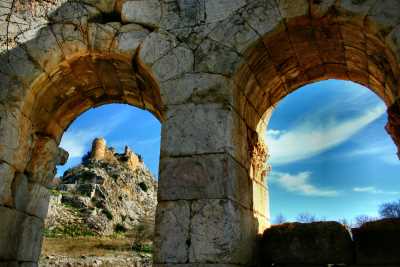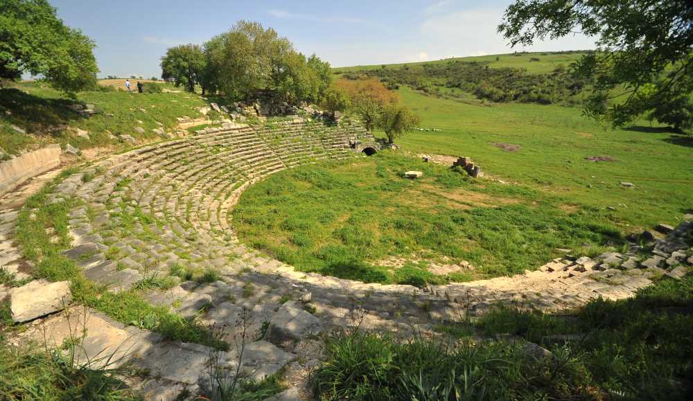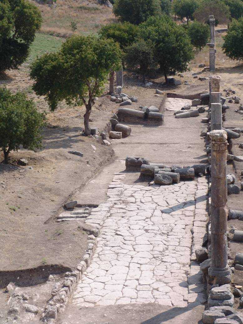 Bu tepenin hâkim olduğu küçük bir vadinin kuzey, güney ve doğu yamaçlarında; M.S. 4. yy. sonlarında inşa edilen surun çevrelediği ızgara planlı kent merkezinin ana aksını; batı-doğu yönünde uzanan iki yanda kaldırımlı, tabanı taş döşeli sütunlu cadde oluşturmaktadır. Tiyatro, hamam, dükkânlar, kuzey ve güney kiliseler bu plana uygun konumlandırılmıştır. Mevcut kamu yapılarının ilk yapı evresi Severuslar dönemine tarihlenmektedir. |