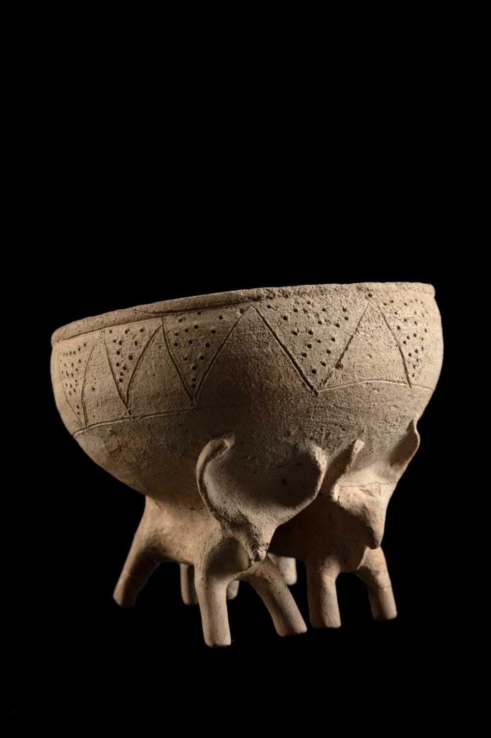Küçük figür, baklava biçimli başı, ellerin belirtilmediği kütük şeklinde kolları ve bacakları ve şişman bedeniyle, bir kaplumbağayı hatırlatır. Kırık yan kenarlarda, diğer figürlerin başlangıçları görülmektedir. Bu da büyük olasılıkla, tüm çanak etrafında dolaşan bir dans sahnesinin tasvir edildiği izlenimi yaratmaktadır.