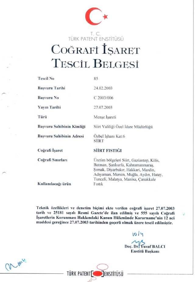 Siirt Fıstığı üretiminin büyük bir bölümü başta İkizbağlar (Tom Köyü) Bağtepe ve Tillo bölgesinde, Eruh, Şirvan ve Siirt İlçe merkezinin büyük bir kesiminde verimin çok iyi durumda olduğu tespit edilmiştir.