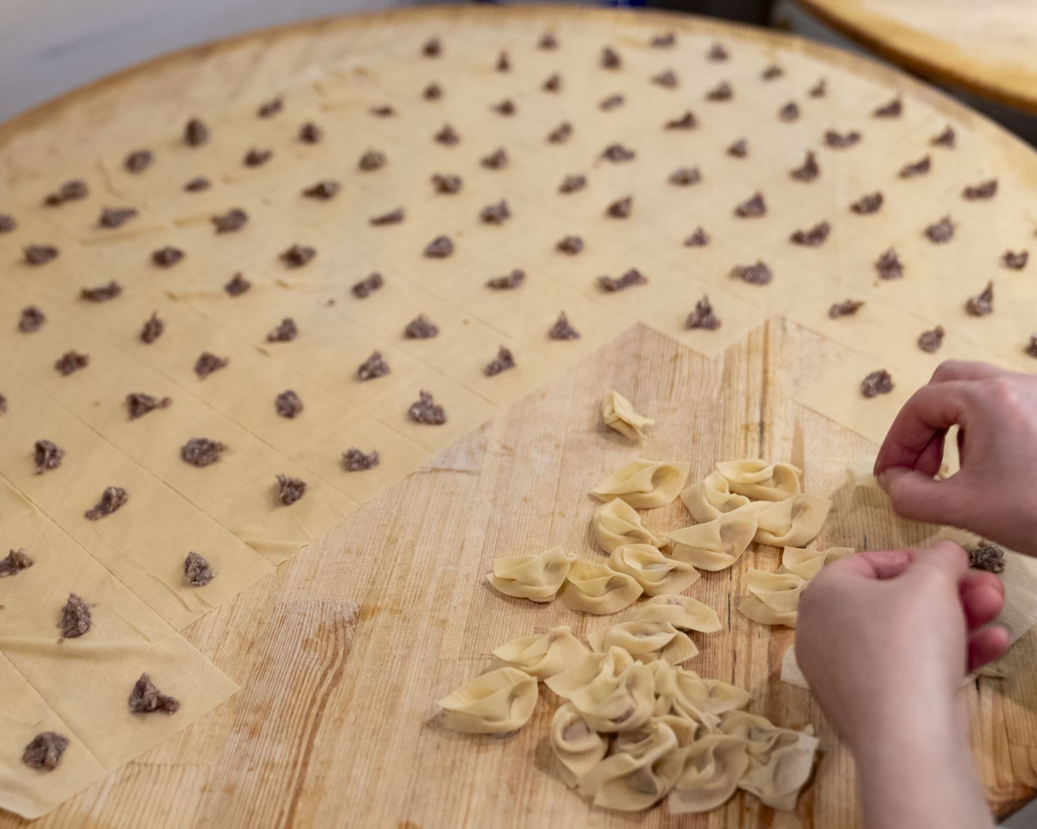 Dinlendirilen hamur, ikiye bölünür. Hamur bezeleri, yapışmamaları için unlanarak 1 - 2 mm kalınlıkta açılır. Açılan yufkalar, 4 - 5 cm ölçülerinde kareler halinde kesilir. Kesme işlemi hamur parçalarının kurumaması için hızlı bir şekilde yapılmalıdır. Kare şeklindeki hamurların üzerlerine silme 1 çay kaşığı iç harç konur ve kareler, üçgen şeklinde katlanarak üçgenin alt iki köşesi birleştirilir. Birleştirilen köşelerin dışında kalan köşe yukarı doğru kaldırılarak hamura kulak şekli verilir.