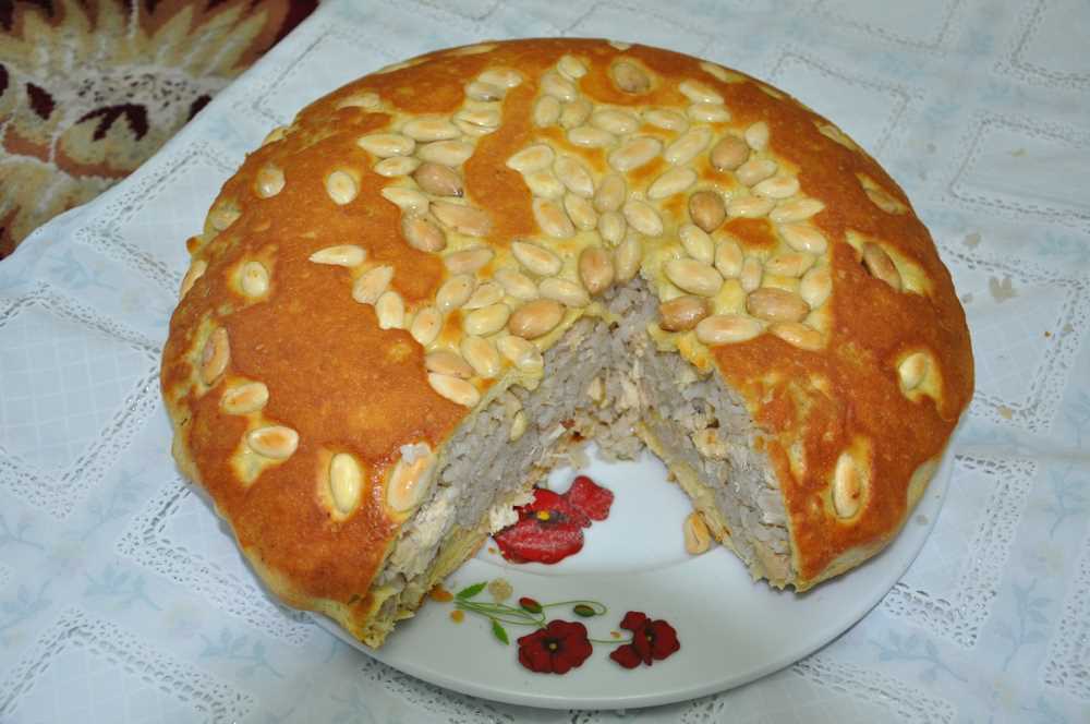 Dibi yuvarlak tencereye yumurta ve yağla yoğrulmuş yufka haline getirilmiş hamur yerleştiririz. Az pişirilen pilava tavuk eti, baharat ve badem karıştırılır ve bu hazırlanan yufka haline getirilmiş hamurun içine konulur. Ağzı tekrar yağlı ve yumurtalı ince hamurla kapatılır. Üstü ve altı ateşte veya fırında pişirilir. Sonra servis yapılır.