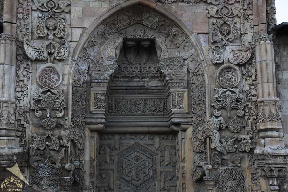 yaptırılan Çifte Minareli Medrese’dir. Günümüze sadece ön cephesi ulaşabilen yapının bitkisel, geometrik ve yazılı bezemelere sahip cephesi ile çifte minareli taç kapısı ihtişamını göstermeye yeterlidir. Medresenin köşe kulelerinde bulunan ve aydınlığı temsil eden mum tasvirleri dikkat çekicidir.