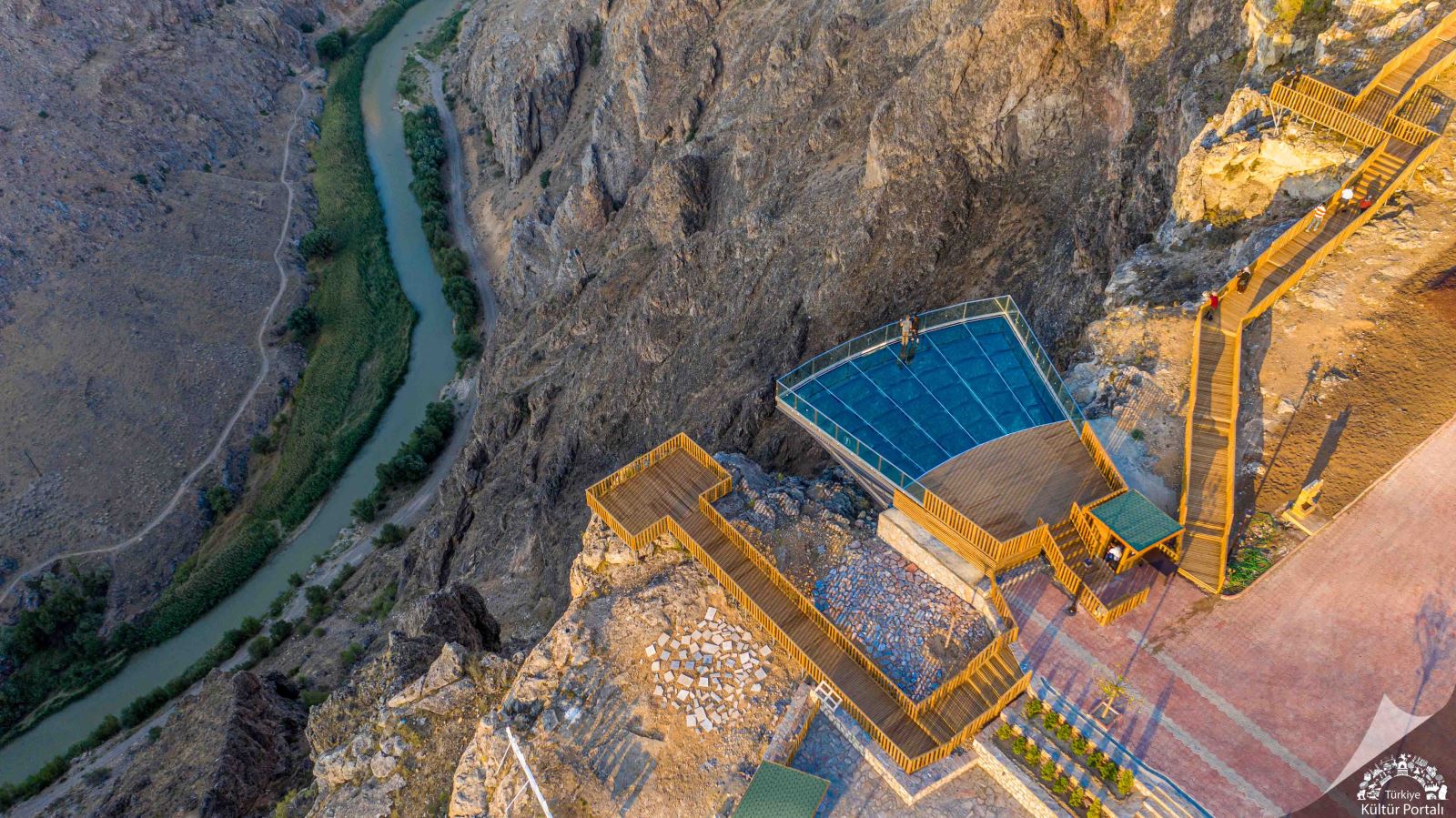 Divriği Cam Seyir Terası, Çaltı Kanyonu’na hâkim tepe üzerinde doğal doku muhafaza edilerek 1200 metre uzunluğunda ahşap yürüme parkurları, ahşap ve cam seyir alanı ile oluşturulmuştur.