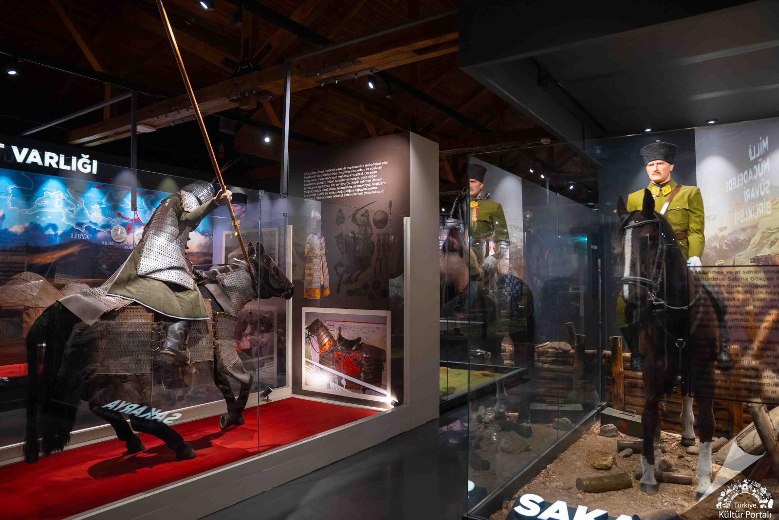 Ayrıca, Fatih Sultan Mehmet Han ve atı “Küheylan”, Sultan II. Abdülhamid Han ve atı “Ferhan” ile Mustafa Kemal Atatürk ve atı “Sakarya” dekoratif canlandırma ve heykellerle tasvir edilmiştir. Bu canlandırmaların yanı sıra belirli dönemlere ait süvarilerin savaş zırhları, savaş aletleri, atların zırh ve koşum takımları heykellerle yansıtılmaktadır. Envanterler birebir replikalardan oluştuğu gibi tarihi eser niteliği taşıyan envanterler de sergilenmekte, gelenek ve kültler ise dioramalarla desteklenmektedir.