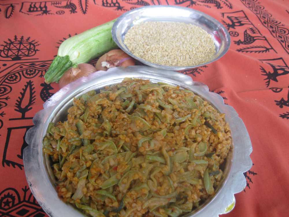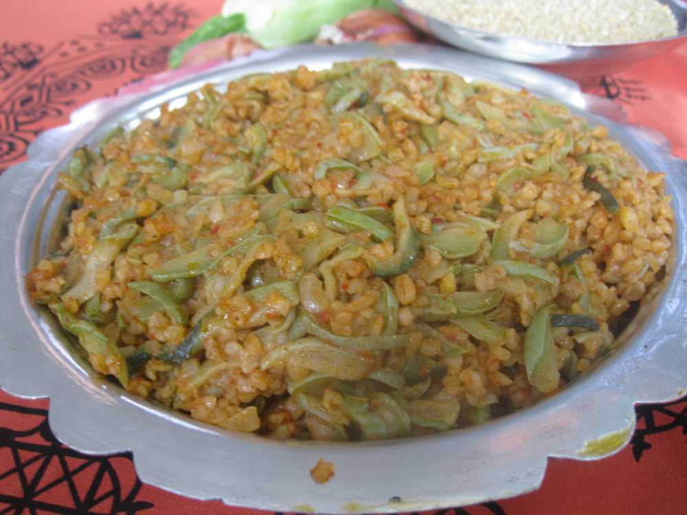 Yıkanmış kabakların kabukları uç ve baş kısımları kesildikten sonra 3 cmeninde çok derin olmayacak şekilde soyulur. Soyulan kabuklar kibrit çöpü kalınlığında doğranır. Geniş bir kabın içerisine tereyağı konularak kızdırılır. Kızdırılan tereyağının içerisine ince doğranmış soğanlar eklenir ve pembeleştirilir. Daha sonra salça eklenerek biraz daha karıştırılır. Doğranmış kabak kabukları ilave edilerek öldürülür. Bulgur eklenir ve kısık ateşte suyunu çekene kadar pişirilir. Tuz ve baharatlar eklenir ve sıcak servis edilir.