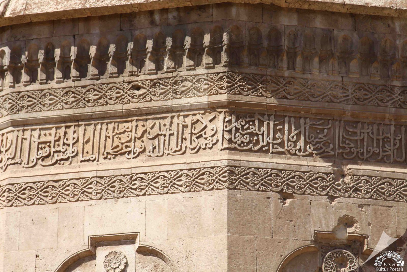 Kümbetin çevresini celi sülüs hatla yazılmış Kur’an-ı Kerim’den Fetih Suresi’nin 1-13. ayetlerinden oluşan bir şerit dolanmaktadır.