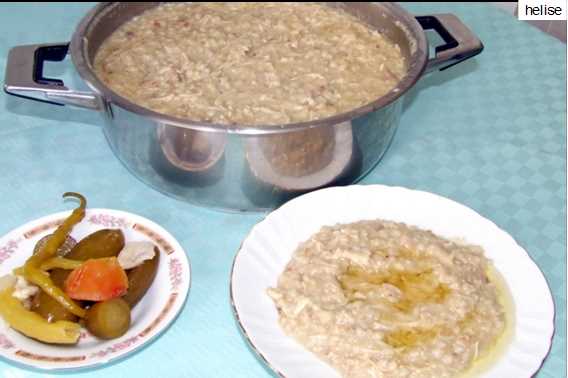 NOT: Helise kırmızı et ile de yapılır. Den, kemikli etle birlikte aynı şekilde kıvama gelinceye kadar pişirilir. Etler kemikten ayrılacak duruma gelince kemikler içinden çıkartılır, aynı şekilde servis yapılır.
