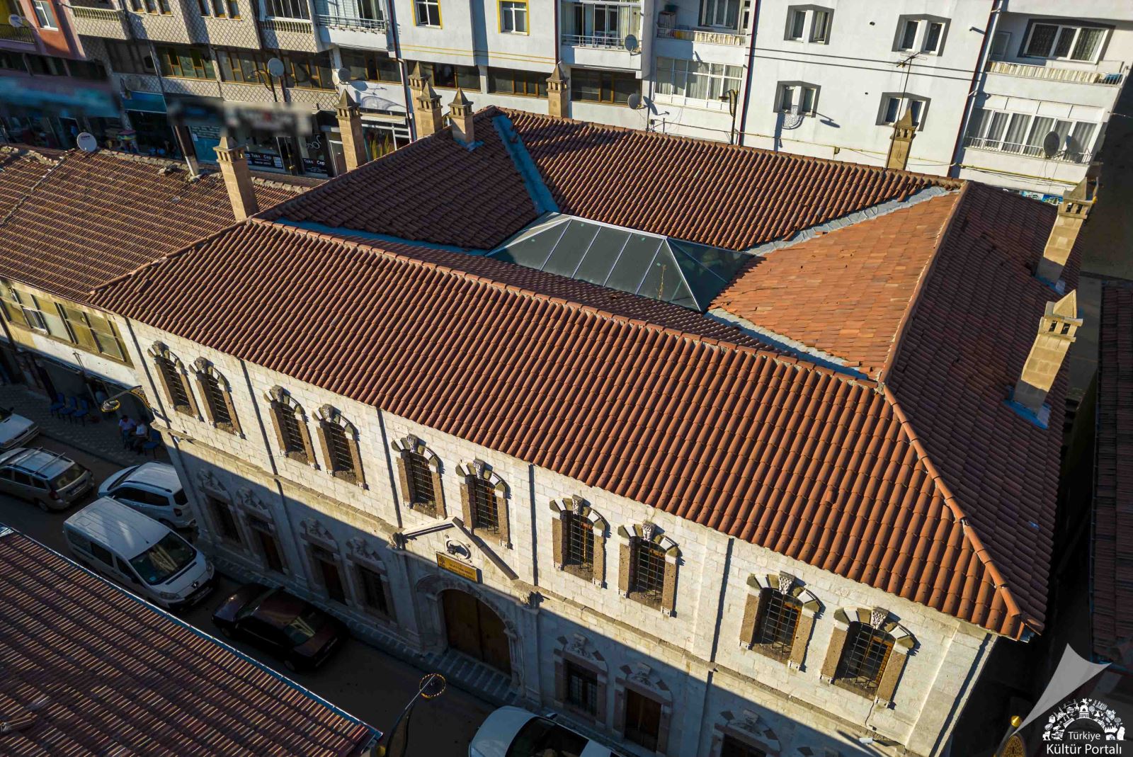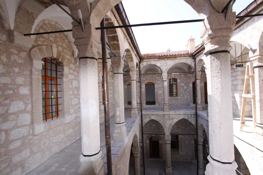 İçeride her iki katta dikdörtgen planlı 10 sütunlu revaklı orta avluya geçilir. Sütun araları kemerli, üst katta tonozludur. Üst kat revak zemini taş odalar ise ahşaptır. Üst katta biri küçük 11 oda bulunmaktadır. Avludan girişin karşısından sağlı sollu iki taş merdivenle arka sokağın seviyesindeki iki kanatlı kapısı olan arka girişe çıkılır.