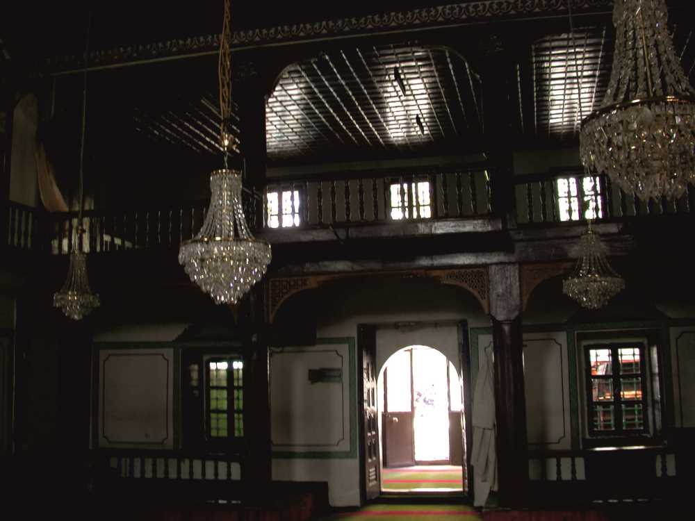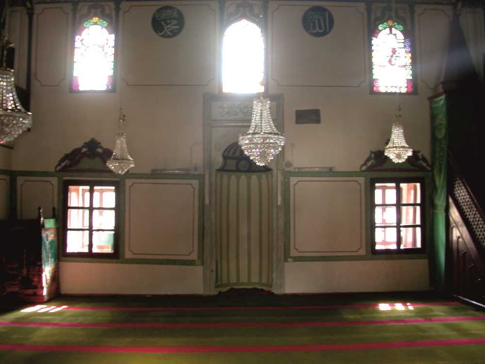 Camiyi her duvarda ikişer tane, dıştan içe doğru genişleyen dikdörtgen alt ve bunların üzerindeki üst pencereleri aydınlatır. Mihrap güney duvarı ekseninde yuvarlak silindirik gövdelidir. Minber mihrabın batısında ahşap bir eserdir. Harimin kuzeyindeki mahfil, son cemaat yerinin üzerine doğru uzanarak dıştan çift katlı bir son cemaat yeri görünümü kazandırmıştır. Son cemaat yeri dışta ve mahfil içte iki büyük ahşap direkle desteklenir. Mahfile harimin kuzeybatı köşesindeki merdivenlerle çıkılır. Üst güneye doğru (kıbleye dikey) uzanan bir galeri oluşturur. Bu galeri ince uzun 7 tane sütunçelere oturur ve birbirlerine bağdadi kemerlerle bağlanır. Mahfilin orta kısmı balkon gibi güneye doğru çıkıntı yapar. Minare harim ile son cemaat yerinin birleştiği köşede bulunur ve son cemaat yerinden çıkılır.