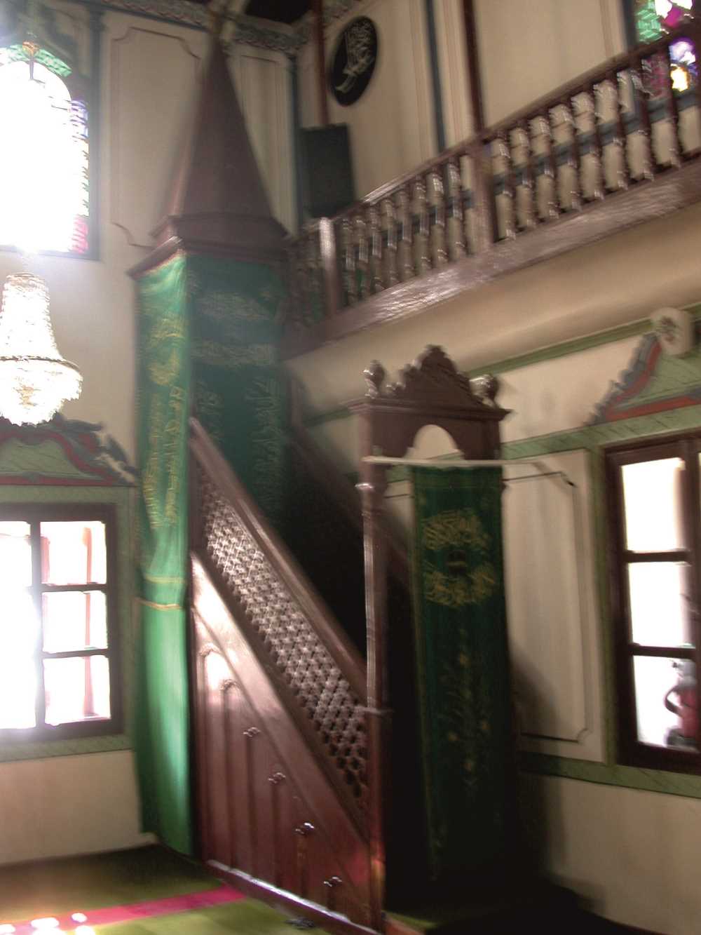 Yapıda ahşap ve kalem işi süslemelere rastlanır. Çift sıra kasetlenmiş tavanın orta kısmı, kare şeklindeki, kat kat profillerle çerçevelenmiştir. Bu profillerin üzeri oyma ve kalem işi, bitkisel ve geometrik motiflerle bezenmiştir. Tavan göbeğinin orta kısmında çam kozalağına benzer bir sarkıt bulunur. Minber, çok sadedir. Korkulukları kafes oyma tekniği ile yapılmıştır. Harimdeki en güzel ahşap süslemelerden birisi de vaiz kürsüsünde görülmektedir. Vaiz kürsüsü, Korinth başlıklı, “C” ve “S” kıvrımların oluşturduğu kemerli, 4 ağaç sütunçe üzerine oturan, yan yüzeyleri kasetleme tekniği ile yapılmıştır. Motifler “C” ve “S” kıvrımlı, geometrik, naturalist ve bitkisel motiflerdir. Kalem işlerinde en çok yaldız boya kullanılmıştır. Ayrıca duvarlarda ve bazı kemer alınlıklarında madalyon içlerine yapılmış yazı motifleri de dikkatimizi çeker.