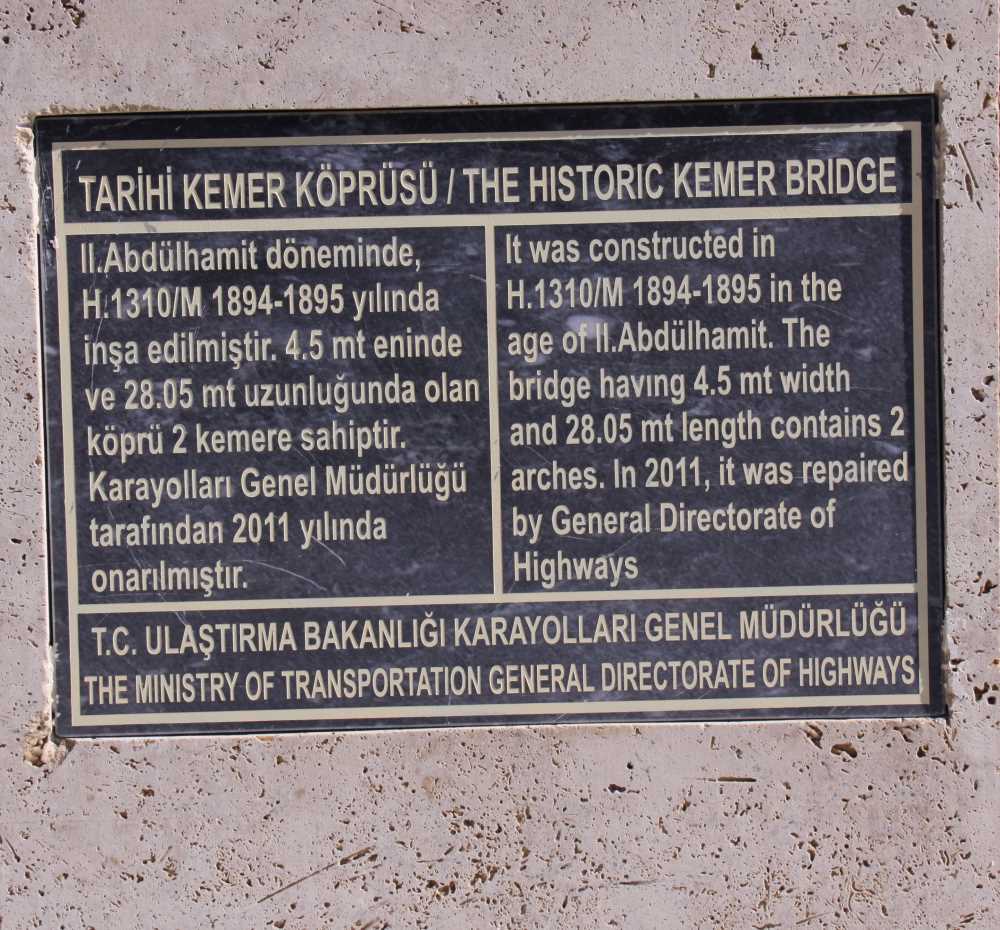 Kemer Köprü II. Abdülhamit döneminde, H.1310/M 1894 – 1895 yılında sarı kesme taştan iki gözlü olarak inşaa edilmiştir. 28,5 metre uzunluğunda ve 4,5 metre genişliğindeki köprüde kemer gözleri basık kemerlidir. Kemer gözlerinin birleştiği noktada iki cephede de kemer ayağında üst kısmı konik, yarım daire formlu birer adet köprü mahmuzu bulunmaktadır. Kemer açıklıkları yaklaşık 5 metre olan köprü üzerinde birbirine geçme, kesme taşlardan oluşan korkuluk duvarı mevcuttur. Bu taşların bir kısmının su yatağına düşmüş olduğu görülmüştür. Köprünün batı cephesinin orta kısmında mahmuzun üstüne gelen bölümde yer alan boşluktan köprünün kitabesinin bulunduğu ancak yerinde mevcut olmadığı tespit edilmiştir. Köprü genel olarak sağlam durumdadır.