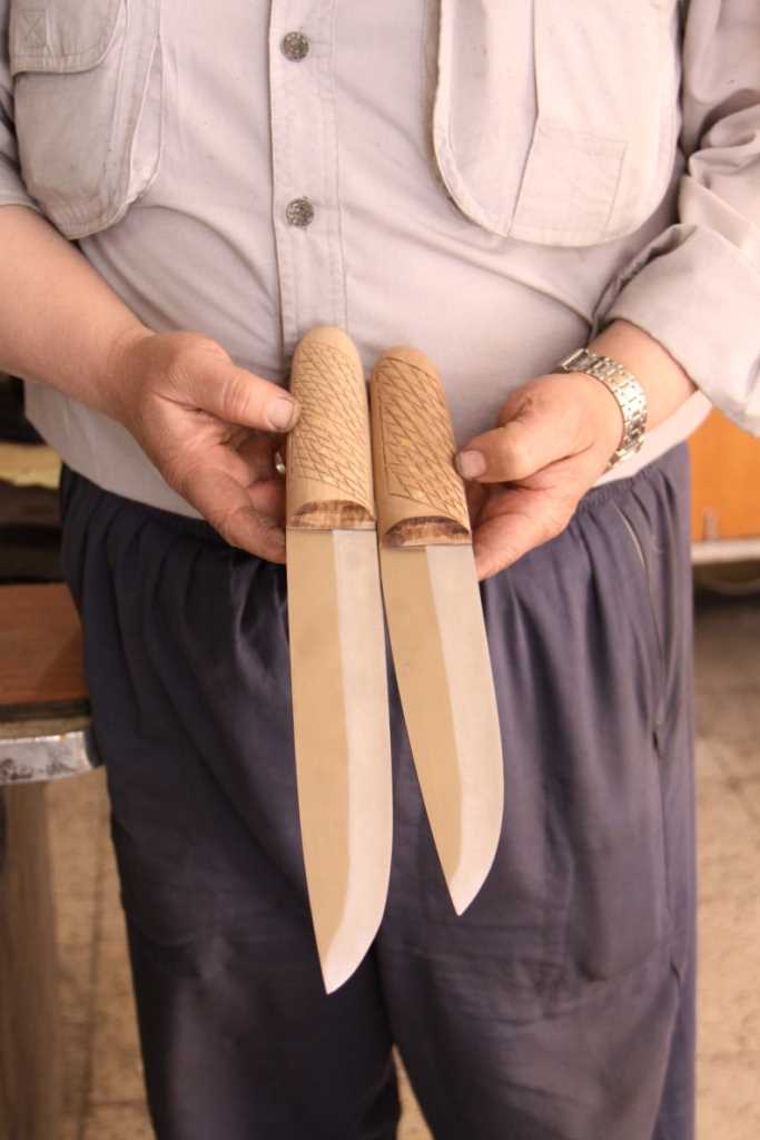 Yörede 40-50 yıl önce kamyon makaslarından bıçak yapılırdı. Şimdi ise hazır getirilen çelik malzemeden bıçak yapılmaktadır. İstenilen ebattaki çelikler körüğün korladığı ateşte iyice dövülerek istenilen şekle sokulur. Ağız inceliği sağlanan çelik keskin hale getirilmek üzere çarka verilir. İncelip tefsiye işi biten çeliğe su, yağ ile birlikte verilir. Çelik çok sertleşirse suyu yeniden alınır. Bıçak ustalığındaki maharet çeliğe su vermekte bulunur. Bıçak için yapılacak olan saplar ya ağaçtan (gürgen, ceviz) veya keçi, manda boynuzundan yapılır. Boynuz da ateşte ısıtılarak örs ve çekiçle bıçak sapı haline getirilip ve daha sonra bu sap cila ile parlatılarak çelikle birleştirilir ve bıçak tamamlanmış olur.