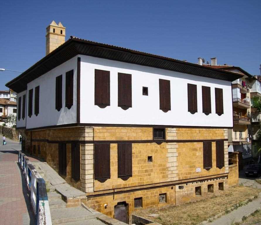 Bodrum kat hariç iki katlı olan, alt katta köfeki taşına benzeyen işlenmesi kolay sarı renkli kesme taşlar üzerinde yükselen konak ince ahşap işçiliği tavan dekorasyonu ve süslemeleri ile dönemin ve günümüzün en güzel örneklerinden biri durumundadır. Eski Yozgat-Sungurlu yolu (şimdiki Hattuşaş yolu) üzerinde C. Ali Efendi Camii’nin yakınında yer alan birinci katı sarı renkli kesme taş (Nevşehir Taşı), ikinci kat kagir olan bu konak kırma çatılıdır. İkinci kat güney-kuzey yönünde çıkıntı yapar. Bu kısmın altı “S” konsollarla desteklenmiştir. Balkon tabanı sonradan betonlanmıştır. İkinci kat balkon pencereleri yuvarlak kemerli olup ahşap çerçevelidir. Binaya giriş, güneydeki taş çerçeveli yuvarlak kemerli bir sundurmadan sağlanmıştır. Bugün üst kata (birinci kata) beş basamaklı taş merdivenle doğudaki dikdörtgen küçük kapıdan çıkılmaktadır. Birinci kat girişi, yuvarlak kemerli ve dört revnaklıdır. Kemerler arasında sarı renkli taştan yapılmış, iyonik başlıklı sütunlar mevcuttur. Revak üzeri oymalı tonozlu sonradan betonlanmıştır. Sekizgen sofanın her köşesinde bir oda yer alır. Güney- batı köşesinde, önemli konukların ikameti için ayrılmış özel bir oda yer alır. Bu odanın tavanı diğer odalarınkilerden daha güzel işlenmiştir. Salonun güney kısmı eyvanı hatırlatır. Bu eyvanın önünde bir balkon bulunmaktadır. Oda kapıları üzerinde görülen sonradan kazınılmış haç şekillerinden ve güneydeki sundurma üzerinde yer alan balkonun üçgen alınlığındaki Rumca yazılardan bu yapının eskiden Rumlara ait olduğu anlaşılmaktadır. Bu üçgen alınlığın ortasındaki Rumca üç satırlık yazı ve 1883 rakamı bu yapının tarihini vermektedir. |