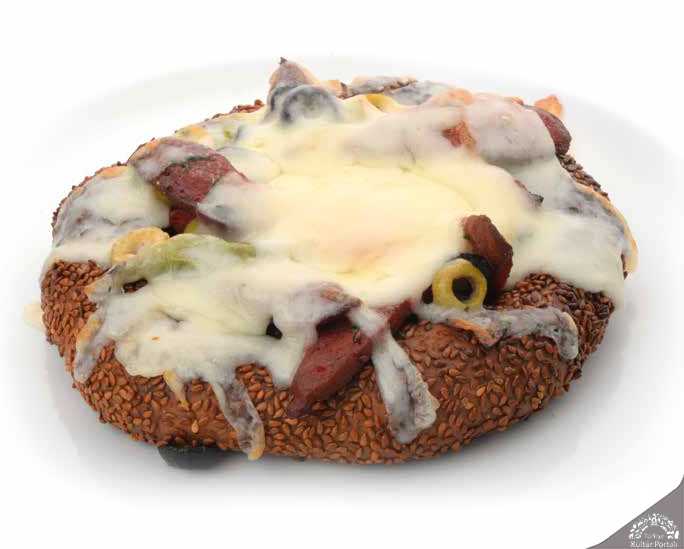 Kızgın tavada önce soğanı daha sonra sırasıyla biber, sucuk ve zeytinleri 5 dk. tereyağı ile kavurunuz. Fırın tepsisine simidi yerleştirin ve hazırlanan malzemeyi ortasına yerleştiriniz. Ortasına yumurtayı kırınız ve maydanozu serpiniz. En üstüne rende kaşarı serpin ve 130 derece fırında peynirleri eriyene kadar pişiriniz.