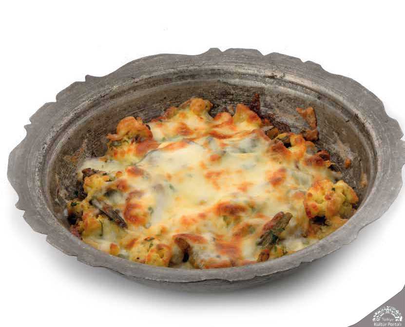 Fırın kabına alınız ve üstüne kaşarı serpiştirip 180 derece fırında üstü kızarana kadar pişirin.